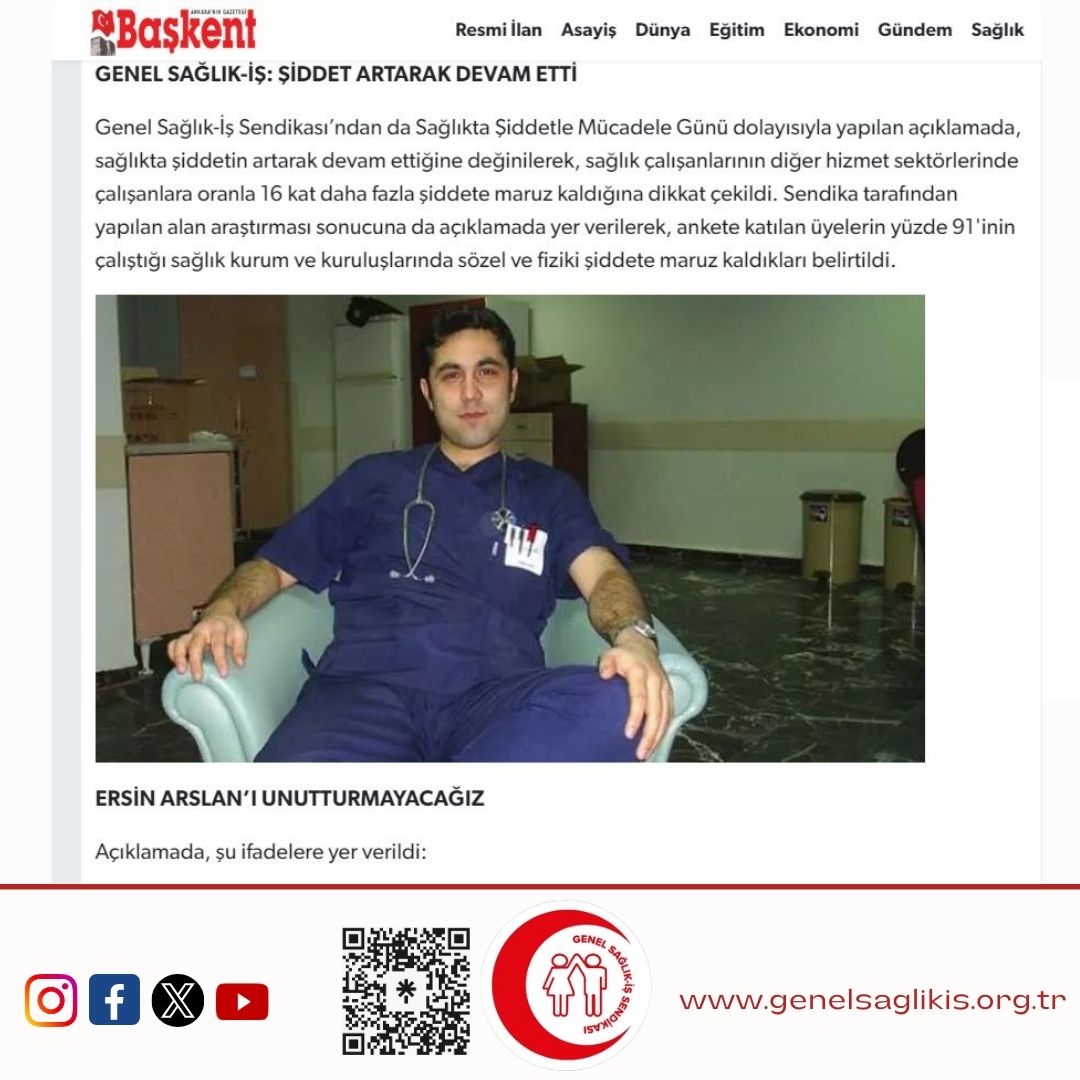 “Sağlık hizmeti verilen kamu kurum ve kuruluşlarında, sağlık çalışanları ile hastaları karşı karşıya getiren sağlığı piyasalaştıran politikalara son verilmesi ve sağlık çalışanlarının saygınlığının toplum karşısında yeniden tesis edilmesi gerekmektedir. Genel Sağlık-İş olarak, sağlıkta şiddete karşı mücadelemizi kararlılıkla sürdürürken, şiddete zemin hazırlayan ticarileştirilmiş sağlık politikalarının da karşısında durmaya devam edeceğiz. Dr. Ersin Arslan’ı unutmadık, unutturmayacağız…”