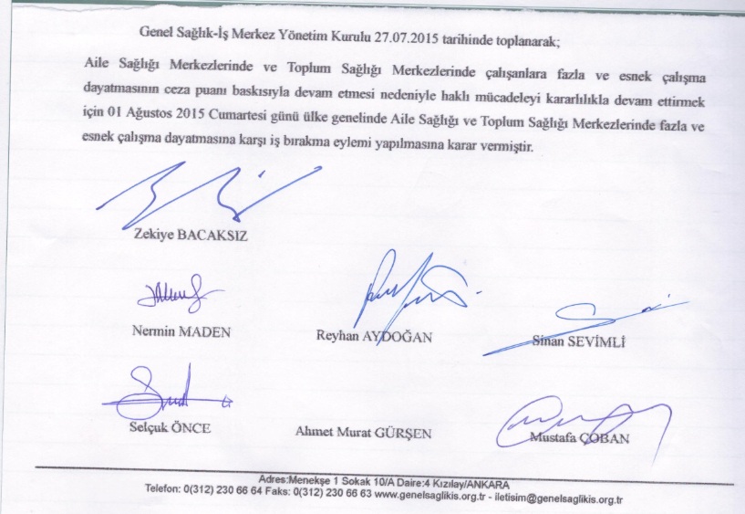 Genel Sağlık- İş Merkez Yönetim Kurulu olarak, 27.07.2015 tarihli kararı ile Aile Sağlığı Merkezlerinde ve Toplum Sağlığı Merkezlerinde çalışanlara fazla ve esnek çalışma dayatmasının ceza puanı baskısıyla devam etmesi nedeniyle haklı mücadeleyi kararlılıkla devam ettirmek için 01 Ağustos 2015 Cumartesi günü ülke genelinde Aile Sağlığı ve Toplum Sağlığı Merkezlerinde fazla ve esnek çalışma dayatmasına karşı iş bırakma eylemi yapılmasına karar verilmiştir.