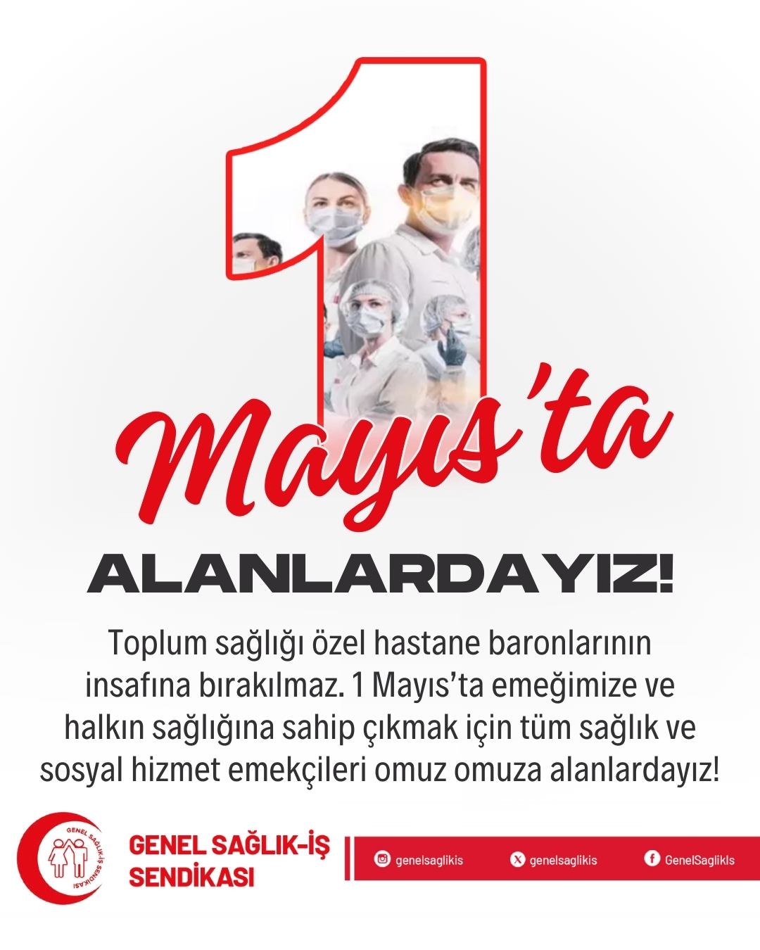 Toplum sağlığı özel hastane baronlarının insafına bırakılmaz. 1 Mayıs'ta emeğimize ve halkın sağlığına sahip çıkmak için tüm sağlık ve sosyal hizmet emekçileri omuz omuza alanlardayız!