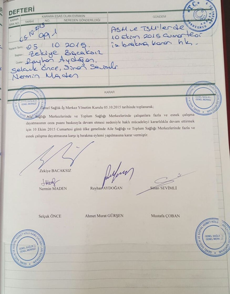 Genel Sağlık- İş Merkez Yönetim Kurulu olarak, 05.10.2015 tarihli kararı ile Aile Sağlığı Merkezlerinde ve Toplum Sağlığı Merkezlerinde çalışanlara fazla ve esnek çalışma dayatmasının ceza puanı baskısıyla devam etmesi nedeniyle haklı mücadeleyi kararlılıkla devam ettirmek için 10 Ekim 2015 Cumartesi günü ülke genelinde Aile Sağlığı ve Toplum Sağlığı Merkezlerinde fazla ve esnek çalışma dayatmasına karşı iş bırakma eylemi yapılmasına karar verilmiştir.