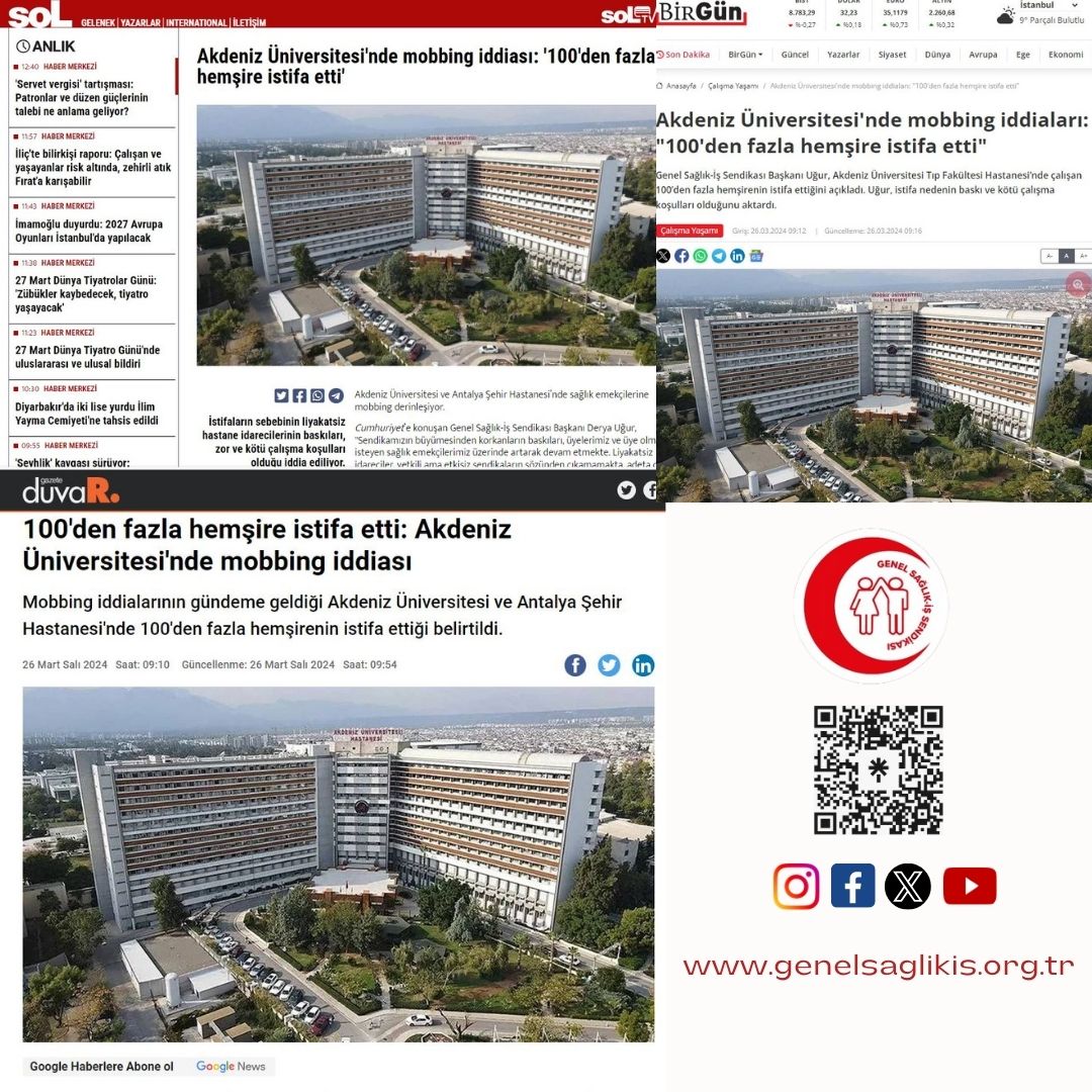 Mobbing iddialarının gündeme geldiği Akdeniz Üniversitesi ve Antalya Şehir Hastanesi'nde 100'den fazla hemşirenin istifa ettiği belirtildi. Genel Sağlık-İş Sendikası Akdeniz Üniversitesi ve Antalya Şehir Hastanesi'nde sağlık emekçilerine uygulanan mobbingin derinleştiğine dikkat çekti. Sendika başkanı Derya Uğur, "Akdeniz Üniversitesi Tıp Fakültesi Hastanesi’nde çalışan 100’ün üzerinde hemşire geçtiğimiz günlerde istifa etmiştir" açıklaması yaptı.