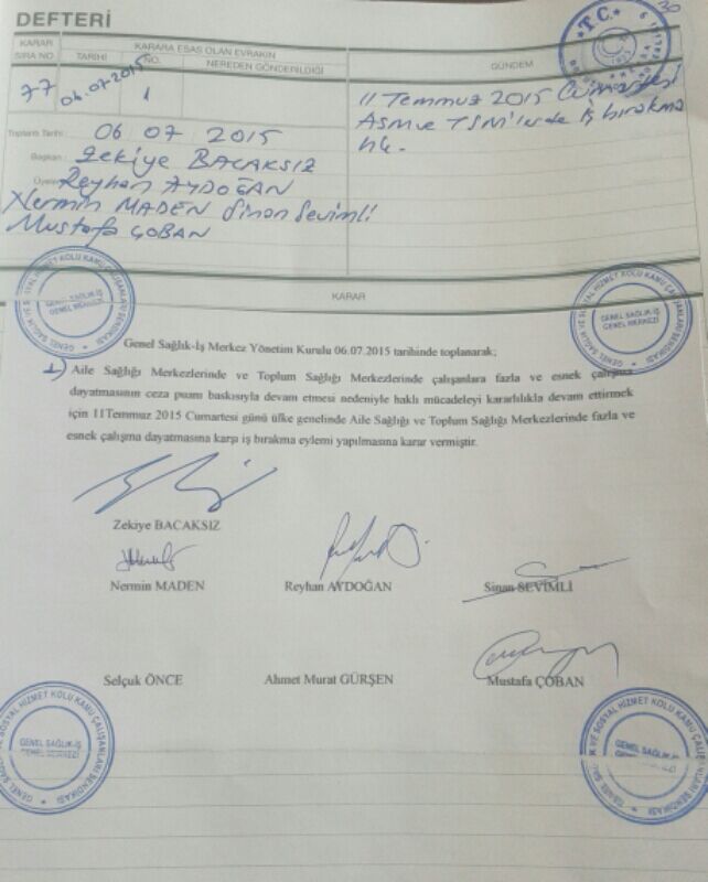Genel Sağlık- İş Merkez Yönetim Kurulu 06.07.2015 tarih ve 77-1 sayılı kararı ile Aile Sağlığı Merkezlerinde ve Toplum Sağlığı Merkezlerinde çalışanlara fazla ve esnek çalışma dayatmasının ceza puanı baskısıyla devam etmesi nedeniyle haklı mücadeleyi kararlılıkla devam ettirmek için 11 Temmuz 2015 Cumartesi günü ülke genelinde Aile Sağlığı ve Toplum Sağlığı Merkezlerinde fazla ve esnek çalışma dayatmasına karşı iş bırakma eylemi yapılmasına karar verilmiştir.