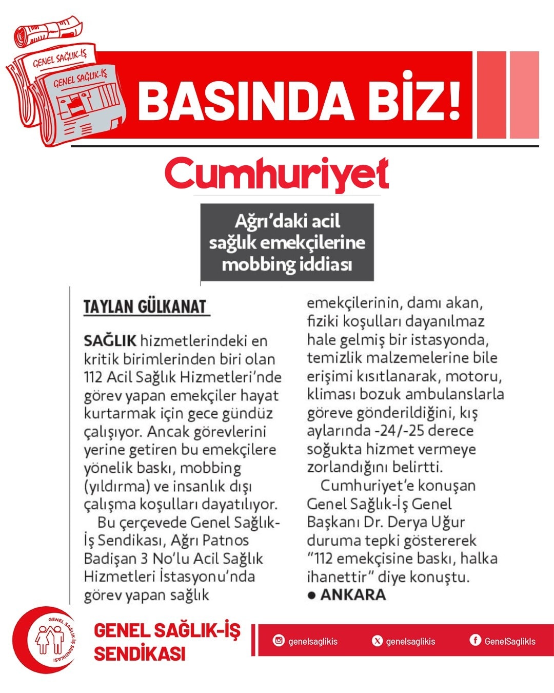 112 acil sağlık emekçileri, hayat kurtarmayı bir görev değil, onurlu bir sorumluluk olarak gören toplumun sessiz kahramanlarıdır. Bu kahramanlar mobbingi değil, hak ettikleri değeri ve insanca çalışma koşulları istemektedir.