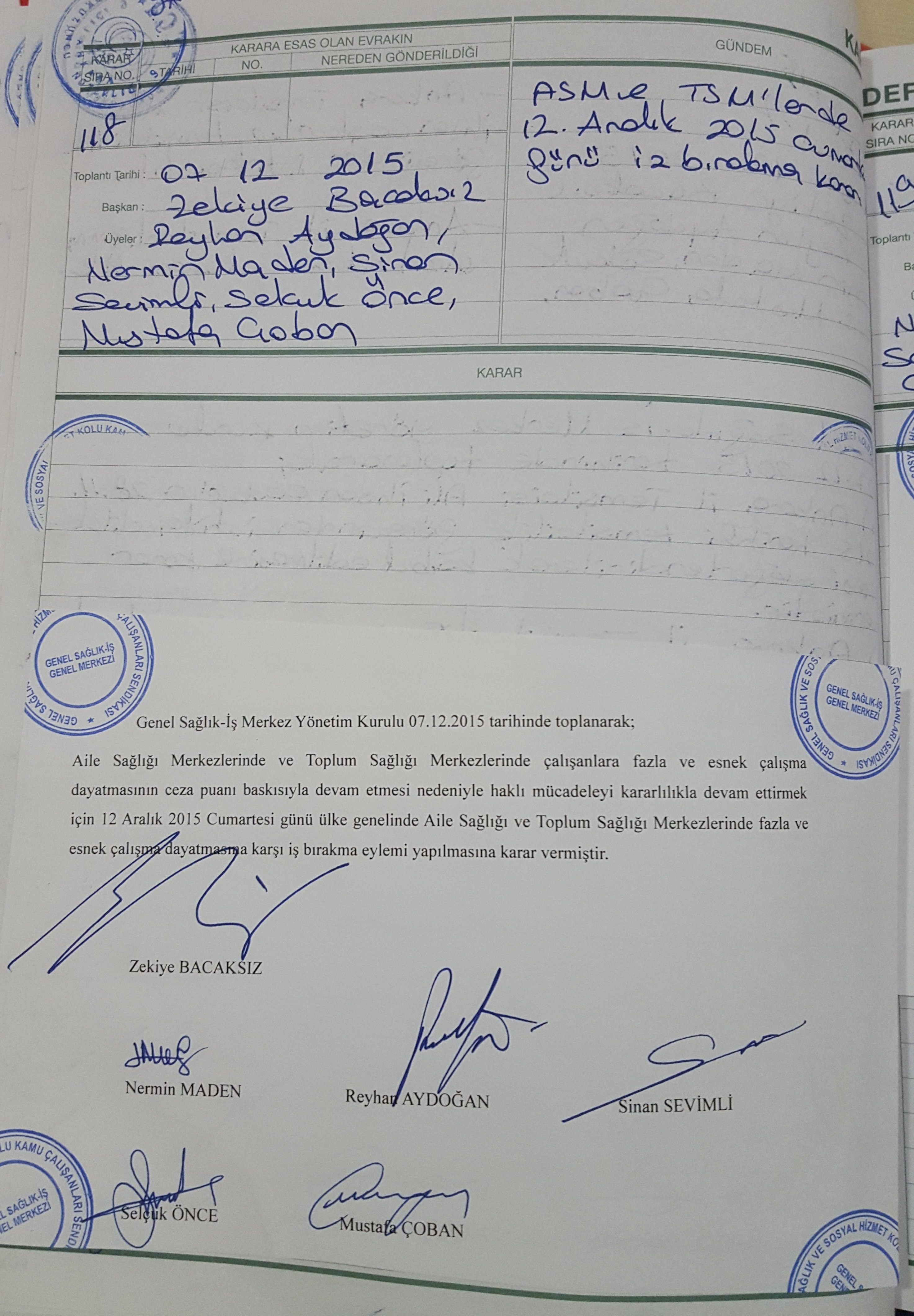 Genel Sağlık- İş Merkez Yönetim Kurulu olarak, 07.12.2015 tarihli kararı ile Aile Sağlığı Merkezlerinde ve Toplum Sağlığı Merkezlerinde çalışanlara fazla ve esnek çalışma dayatmasının ceza puanı baskısıyla devam etmesi nedeniyle haklı mücadeleyi kararlılıkla devam ettirmek için 12 ARALIK 2015 Cumartesi günü ülke genelinde Aile Sağlığı ve Toplum Sağlığı Merkezlerinde fazla ve esnek çalışma dayatmasına karşı iş bırakma eylemi yapılmasına karar verilmiştir.