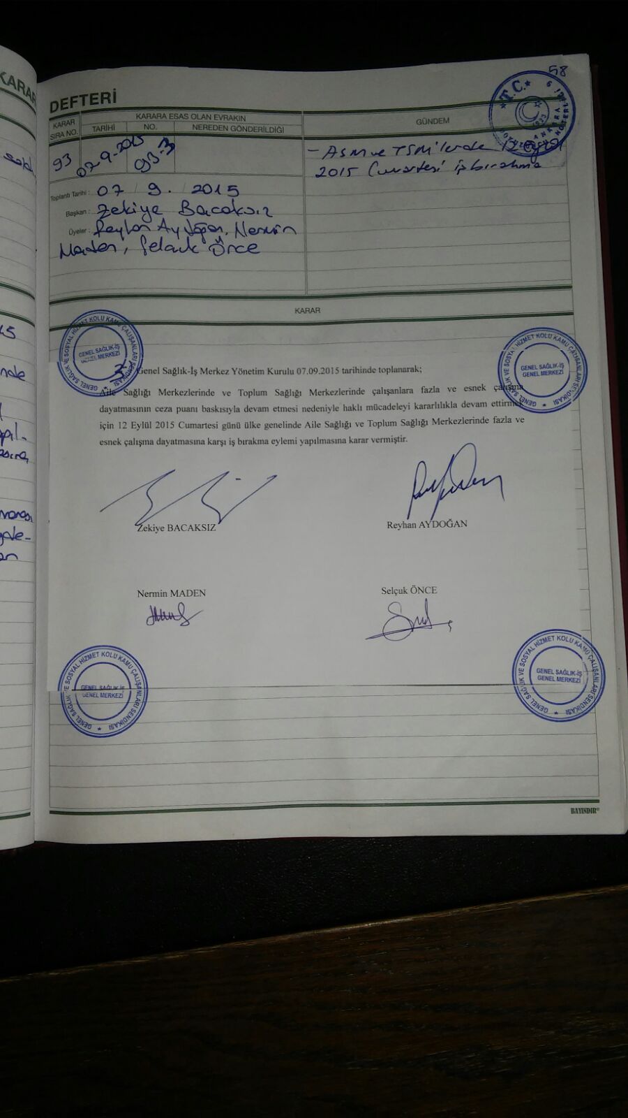 Genel Sağlık- İş Merkez Yönetim Kurulu olarak, 07.09.2015 tarihli kararı ile Aile Sağlığı Merkezlerinde ve Toplum Sağlığı Merkezlerinde çalışanlara fazla ve esnek çalışma dayatmasının ceza puanı baskısıyla devam etmesi nedeniyle haklı mücadeleyi kararlılıkla devam ettirmek için 12 Eylül 2015 Cumartesi günü ülke genelinde Aile Sağlığı ve Toplum Sağlığı Merkezlerinde fazla ve esnek çalışma dayatmasına karşı iş bırakma eylemi yapılmasına karar verilmiştir.