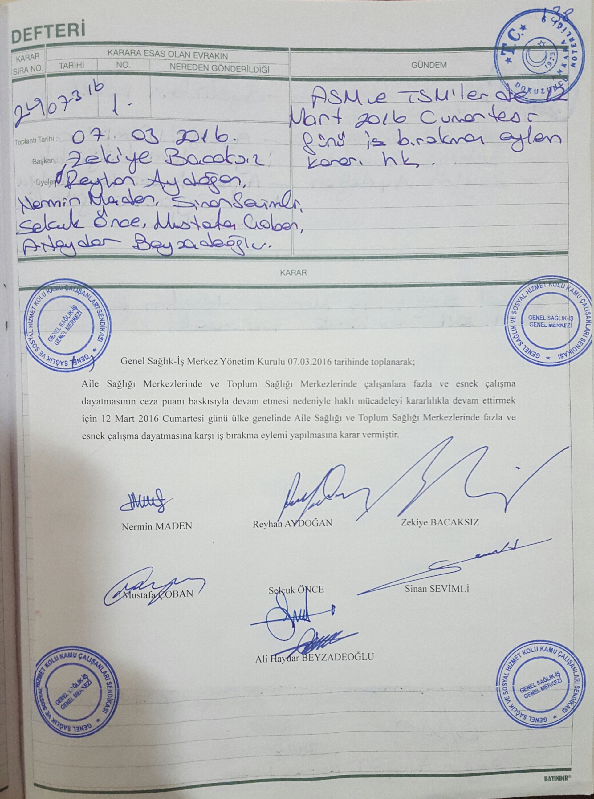 Genel Sağlık- İş Merkez Yönetim Kurulu olarak, 07.03.2016 tarihli kararı ile Aile Sağlığı Merkezlerinde ve Toplum Sağlığı Merkezlerinde çalışanlara fazla ve esnek çalışma dayatmasının ceza puanı baskısıyla devam etmesi nedeniyle haklı mücadeleyi kararlılıkla devam ettirmek için 12 MART 2016 Cumartesi günü ülke genelinde Aile Sağlığı ve Toplum Sağlığı Merkezlerinde fazla ve esnek çalışma dayatmasına karşı iş bırakma eylemi yapılmasına karar verilmiştir. Tüm üyelerimizi iş bırakmaya davet ediyoruz. Genel Merkez Yönetim Kurulu 12 MART 2016 ASM ve TSM'lerde İş Bırakma Kararı Savunma Yazısı Valiliğe itiraz dilekçesiGenel Sağlık-İş olarak, sağlık çalışanlarının haklarını korumak için var gücümüzle çalışıyoruz. Sen de bu mücadelede yerini al, birlikte daha güçlü olalım. Hemen üye ol, sesimizi daha da yükseltelim!
