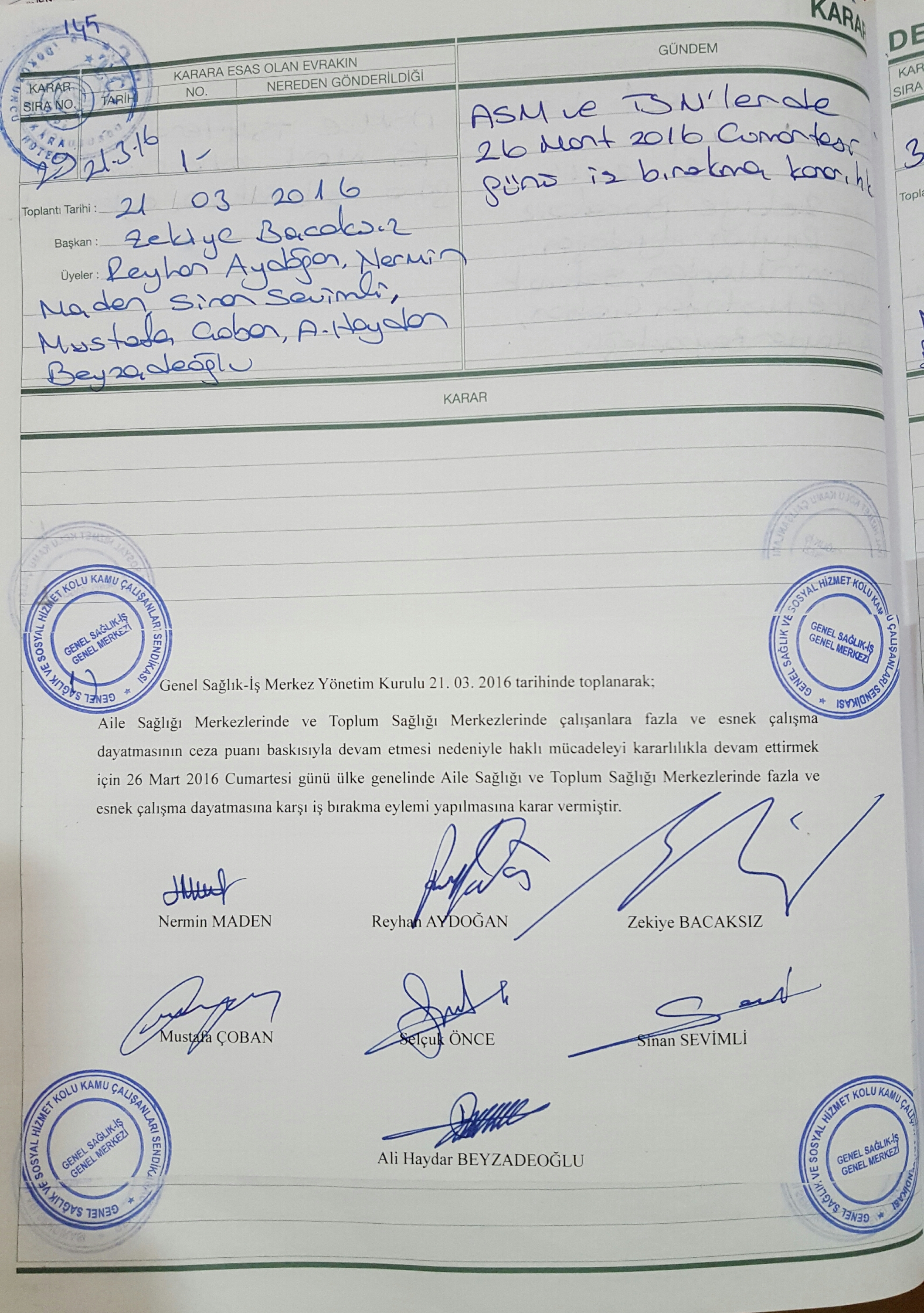 Genel Sağlık- İş Merkez Yönetim Kurulu olarak, 21.03.2016 tarihli kararı ile Aile Sağlığı Merkezlerinde ve Toplum Sağlığı Merkezlerinde çalışanlara fazla ve esnek çalışma dayatmasının ceza puanı baskısıyla devam etmesi nedeniyle haklı mücadeleyi kararlılıkla devam ettirmek için 26 MART 2016 Cumartesi günü ülke genelinde Aile Sağlığı ve Toplum Sağlığı Merkezlerinde fazla ve esnek çalışma dayatmasına karşı iş bırakma eylemi yapılmasına karar verilmiştir. Tüm üyelerimizi iş bırakmaya davet ediyoruz. Genel Merkez Yönetim Kurulu 26 MART 2016 ASM ve TSM'lerde İş Bırakma Kararı Savunma Yazısı Valiliğe itiraz dilekçesiGenel Sağlık-İş olarak, sağlık çalışanlarının haklarını korumak için var gücümüzle çalışıyoruz. Sen de bu mücadelede yerini al, birlikte daha güçlü olalım. Hemen üye ol, sesimizi daha da yükseltelim!