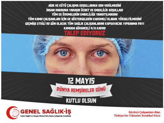 İçinde bulunduğumuz bu zor günlerin geride kalması, sağlık emekçilerinin insan onuruna yaraşır bir yaşam ve çalışma koşullarına kavuşması mücadele azmi ve inancıyla; tüm meslektaşlarımın 12 Mayıs Dünya Hemşireler Gününü kutluyor, sarı sendikaların yaşattığı hak kayıplarını önlemek ve haklarımızı geliştirmek için Genel Sağlık-İş’te birlikte mücadeleye davet ediyoruz.