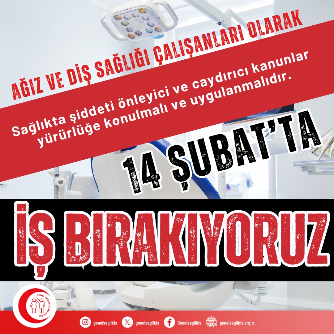 Ağız ve Diş Sağlığı Çalışanları Olarak Sağlıkta şiddeti önleyici ve caydırıcı kanunlar yürürlüğe konulmalı ve uygulanmalıdır. 14 Şubat'ta İş Bırakıyoruz!