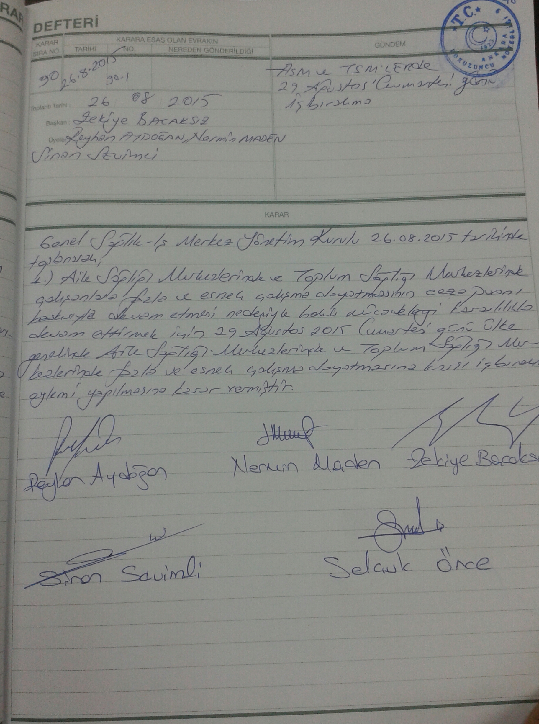 Genel Sağlık- İş Merkez Yönetim Kurulu olarak, 26.08.2015 tarihli kararı ile Aile Sağlığı Merkezlerinde ve Toplum Sağlığı Merkezlerinde çalışanlara fazla ve esnek çalışma dayatmasının ceza puanı baskısıyla devam etmesi nedeniyle haklı mücadeleyi kararlılıkla devam ettirmek için 29 Ağustos 2015 Cumartesi günü ülke genelinde Aile Sağlığı ve Toplum Sağlığı Merkezlerinde fazla ve esnek çalışma dayatmasına karşı iş bırakma eylemi yapılmasına karar verilmiştir.