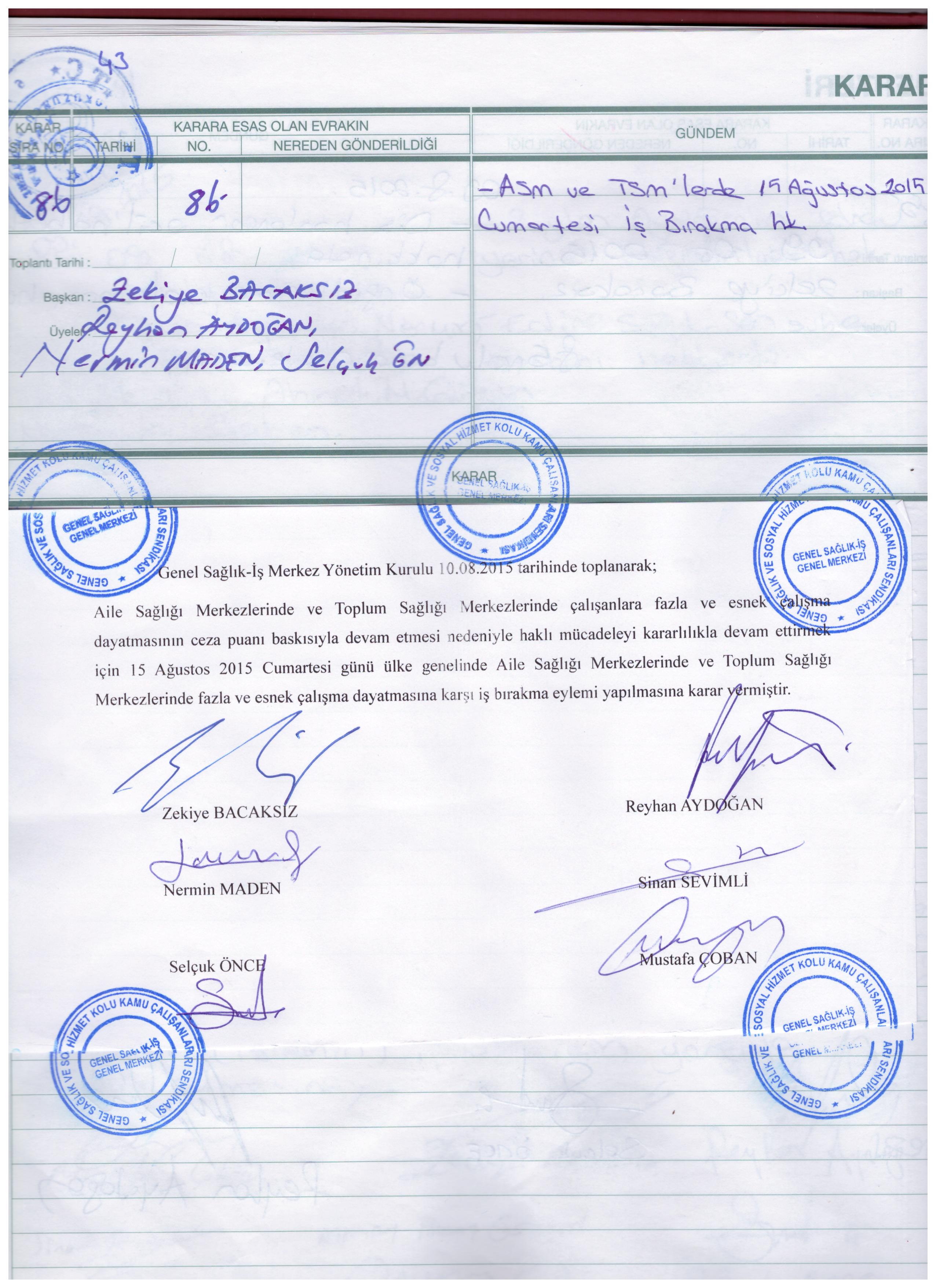 Genel Sağlık- İş Merkez Yönetim Kurulu olarak, 10.08.2015 tarihli kararı ile Aile Sağlığı Merkezlerinde ve Toplum Sağlığı Merkezlerinde çalışanlara fazla ve esnek çalışma dayatmasının ceza puanı baskısıyla devam etmesi nedeniyle haklı mücadeleyi kararlılıkla devam ettirmek için 15 Ağustos 2015 Cumartesi günü ülke genelinde Aile Sağlığı ve Toplum Sağlığı Merkezlerinde fazla ve esnek çalışma dayatmasına karşı iş bırakma eylemi yapılmasına karar verilmiştir.