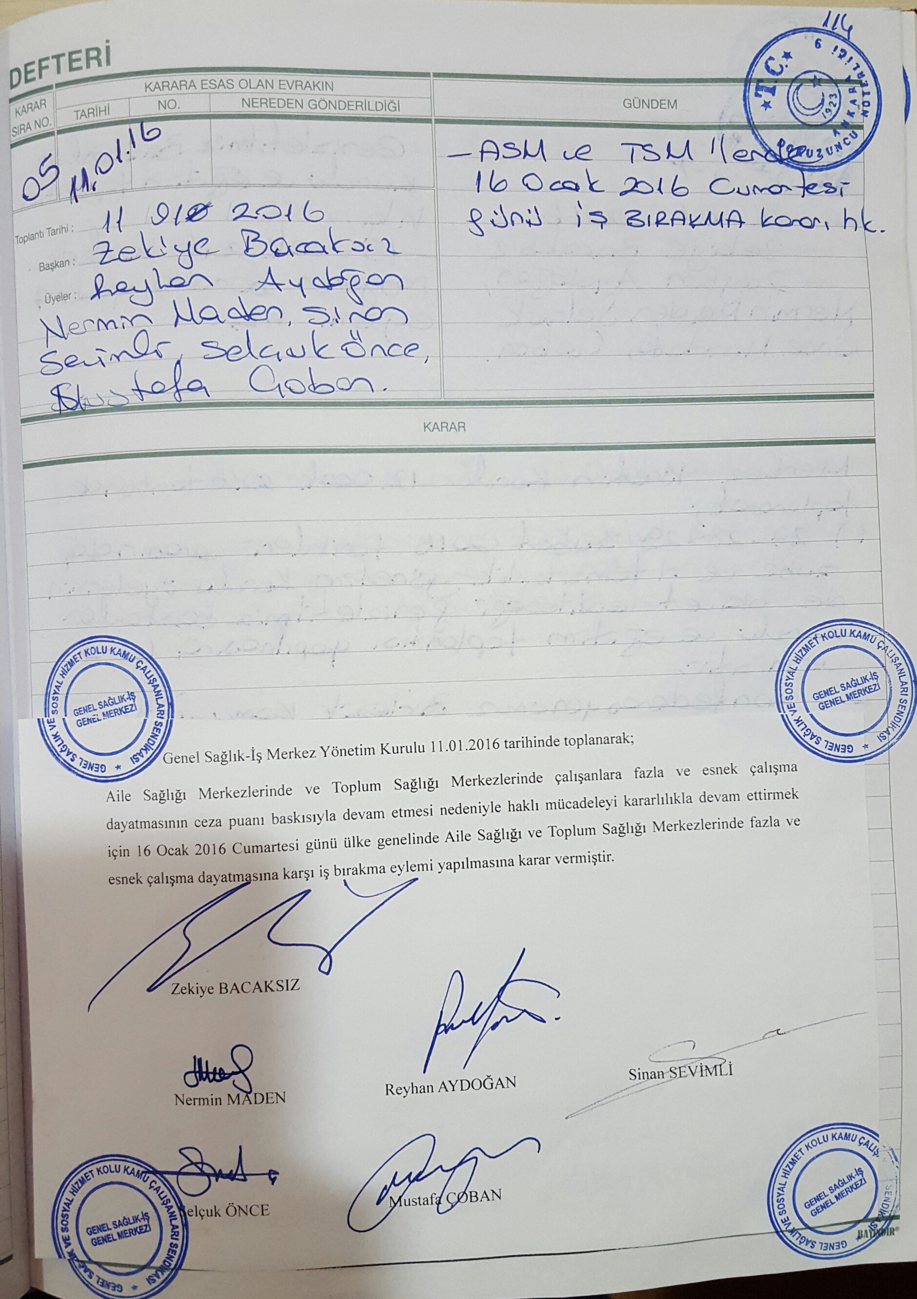Genel Sağlık- İş Merkez Yönetim Kurulu olarak, 11.01.2016 tarihli kararı ile Aile Sağlığı Merkezlerinde ve Toplum Sağlığı Merkezlerinde çalışanlara fazla ve esnek çalışma dayatmasının ceza puanı baskısıyla devam etmesi nedeniyle haklı mücadeleyi kararlılıkla devam ettirmek için 16 OCAK 2016 Cumartesi günü ülke genelinde Aile Sağlığı ve Toplum Sağlığı Merkezlerinde fazla ve esnek çalışma dayatmasına karşı iş bırakma eylemi yapılmasına karar verilmiştir. Tüm üyelerimizi iş bırakmaya davet ediyoruz. Genel Merkez Yönetim Kurulu 16 OCAK 2016 ASM ve TSM'lerde İş Bırakma Kararı Savunma Yazısı Valiliğe itiraz dilekçesiGenel Sağlık-İş olarak, sağlık çalışanlarının haklarını korumak için var gücümüzle çalışıyoruz. Sen de bu mücadelede yerini al, birlikte daha güçlü olalım. Hemen üye ol, sesimizi daha da yükseltelim!