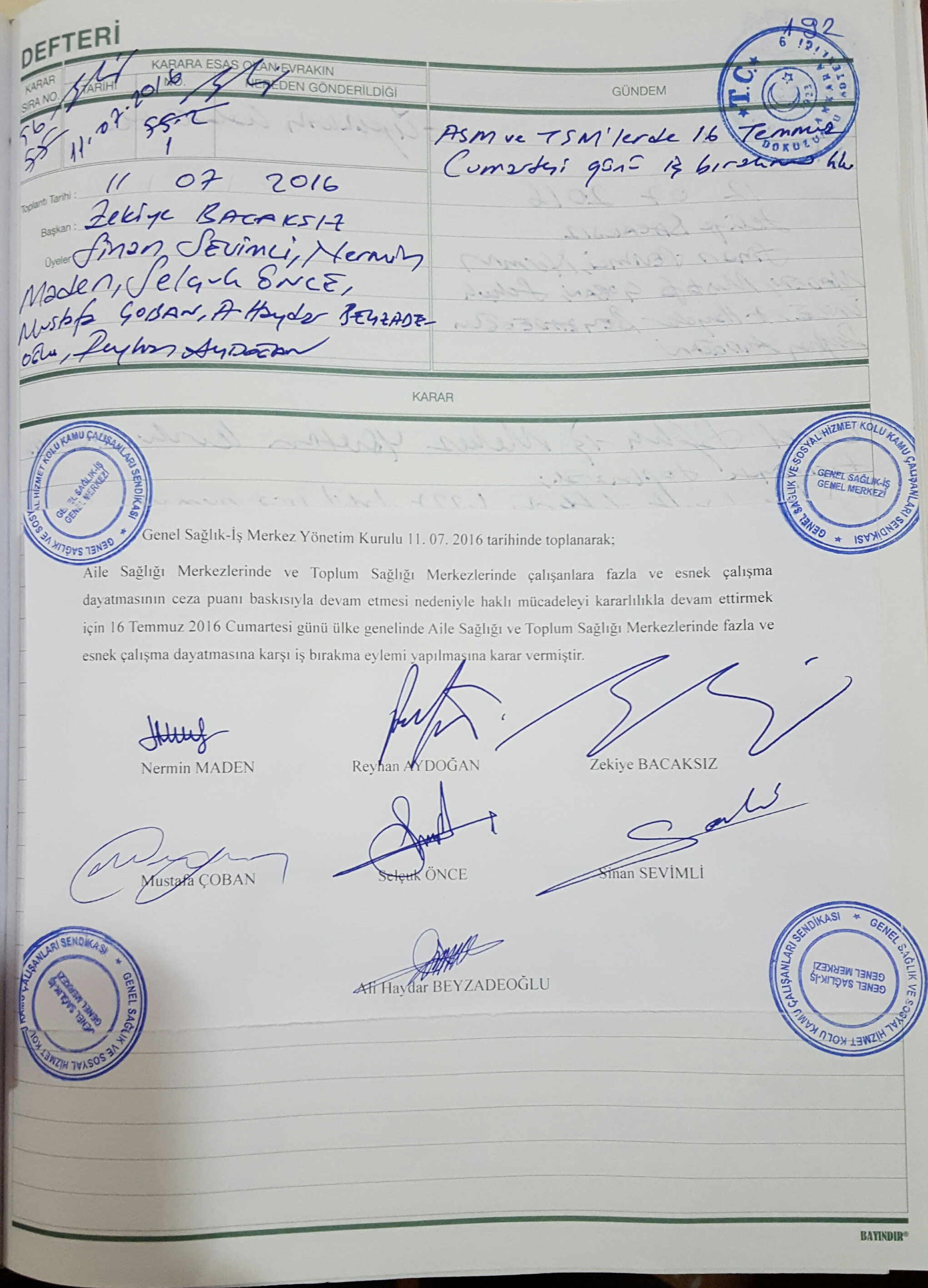 Genel Sağlık- İş Merkez Yönetim Kurulu olarak, 11.07.2016 tarihli kararı ile Aile Sağlığı Merkezlerinde ve Toplum Sağlığı Merkezlerinde çalışanlara fazla ve esnek çalışma dayatmasının ceza puanı baskısıyla devam etmesi nedeniyle haklı mücadeleyi kararlılıkla devam ettirmek için 16 TEMMUZ 2016 Cumartesi günü ülke genelinde Aile Sağlığı ve Toplum Sağlığı Merkezlerinde fazla ve esnek çalışma dayatmasına karşı iş bırakma eylemi yapılmasına karar verilmiştir. Tüm üyelerimizi iş bırakmaya davet ediyoruz. Genel Merkez Yönetim Kurulu 16 TEMMUZ 2016 ASM ve TSM'lerde İş Bırakma Kararı Savunma Yazısı Valiliğe itiraz dilekçesiGenel Sağlık-İş olarak, sağlık çalışanlarının haklarını korumak için var gücümüzle çalışıyoruz. Sen de bu mücadelede yerini al, birlikte daha güçlü olalım. Hemen üye ol, sesimizi daha da yükseltelim!