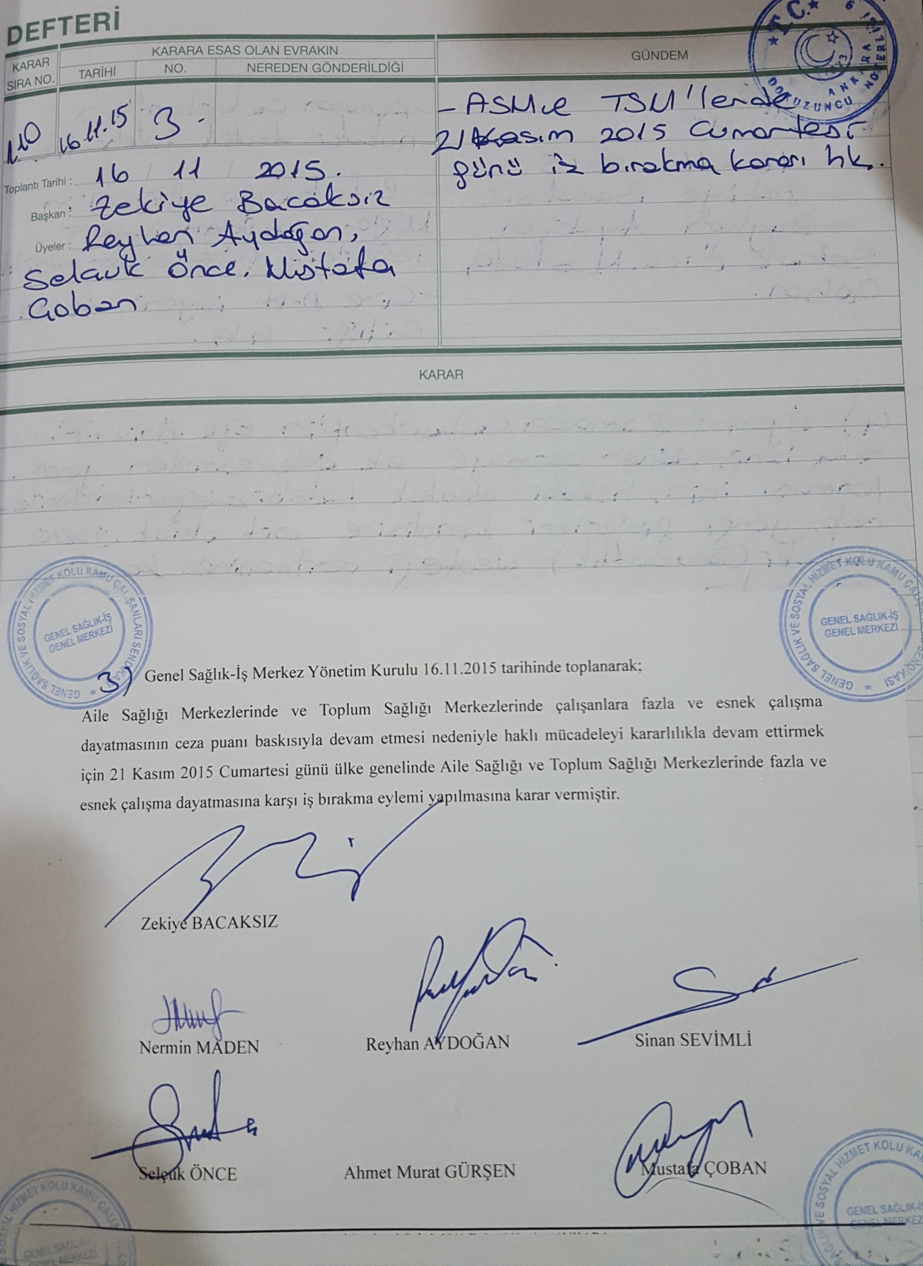 Genel Sağlık- İş Merkez Yönetim Kurulu olarak, 16.11.2015 tarihli kararı ile Aile Sağlığı Merkezlerinde ve Toplum Sağlığı Merkezlerinde çalışanlara fazla ve esnek çalışma dayatmasının ceza puanı baskısıyla devam etmesi nedeniyle haklı mücadeleyi kararlılıkla devam ettirmek için 21 KASIM 2015 Cumartesi günü ülke genelinde Aile Sağlığı ve Toplum Sağlığı Merkezlerinde fazla ve esnek çalışma dayatmasına karşı iş bırakma eylemi yapılmasına karar verilmiştir.