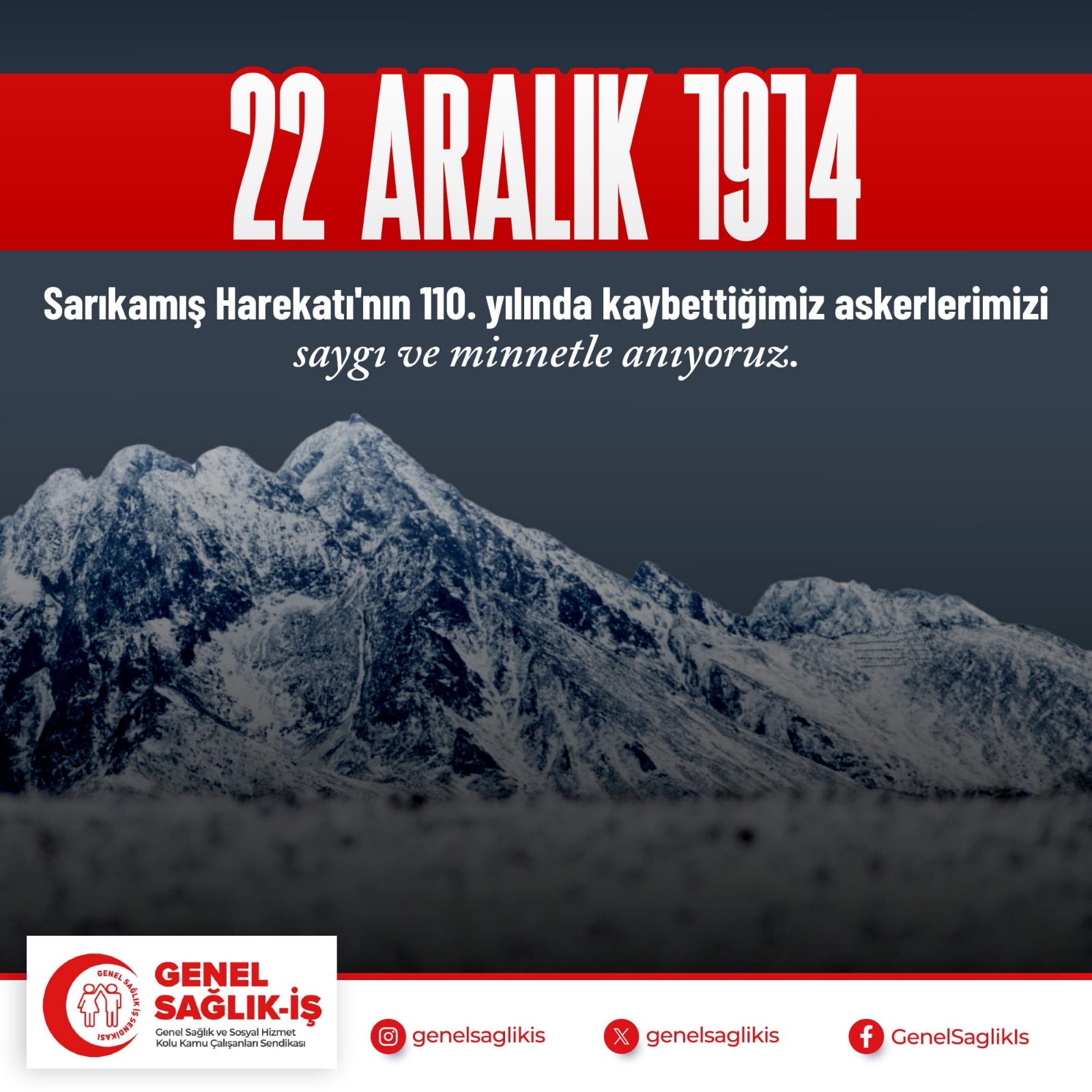 110 yıl önce, 22 Aralık 1914 tarihinde Osmanlı ordusunun Rus işgali altındaki toprakları kurtarmak için başlattığı Sarıkamış Harekatı'nda 60 bini donarak olmak üzere 78 bin askerimiz şehit oldu.