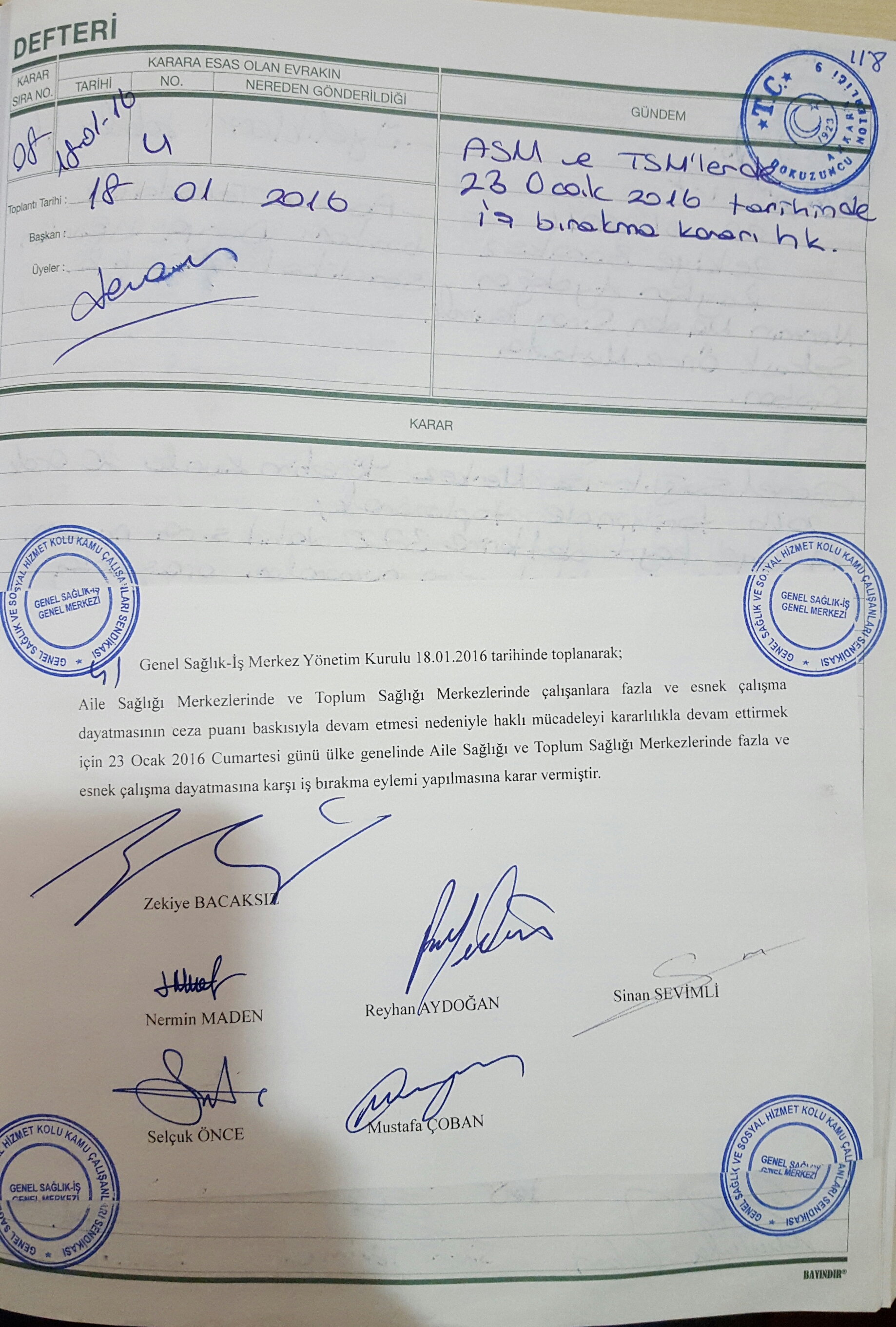 Genel Sağlık- İş Merkez Yönetim Kurulu olarak, 18.01.2016 tarihli kararı ile Aile Sağlığı Merkezlerinde ve Toplum Sağlığı Merkezlerinde çalışanlara fazla ve esnek çalışma dayatmasının ceza puanı baskısıyla devam etmesi nedeniyle haklı mücadeleyi kararlılıkla devam ettirmek için 23 OCAK 2016 Cumartesi günü ülke genelinde Aile Sağlığı ve Toplum Sağlığı Merkezlerinde fazla ve esnek çalışma dayatmasına karşı iş bırakma eylemi yapılmasına karar verilmiştir. Tüm üyelerimizi iş bırakmaya davet ediyoruz. Genel Merkez Yönetim Kurulu 23 OCAK 2016 ASM ve TSM'lerde İş Bırakma Kararı Savunma Yazısı Valiliğe itiraz dilekçesiGenel Sağlık-İş olarak, sağlık çalışanlarının haklarını korumak için var gücümüzle çalışıyoruz. Sen de bu mücadelede yerini al, birlikte daha güçlü olalım. Hemen üye ol, sesimizi daha da yükseltelim!
