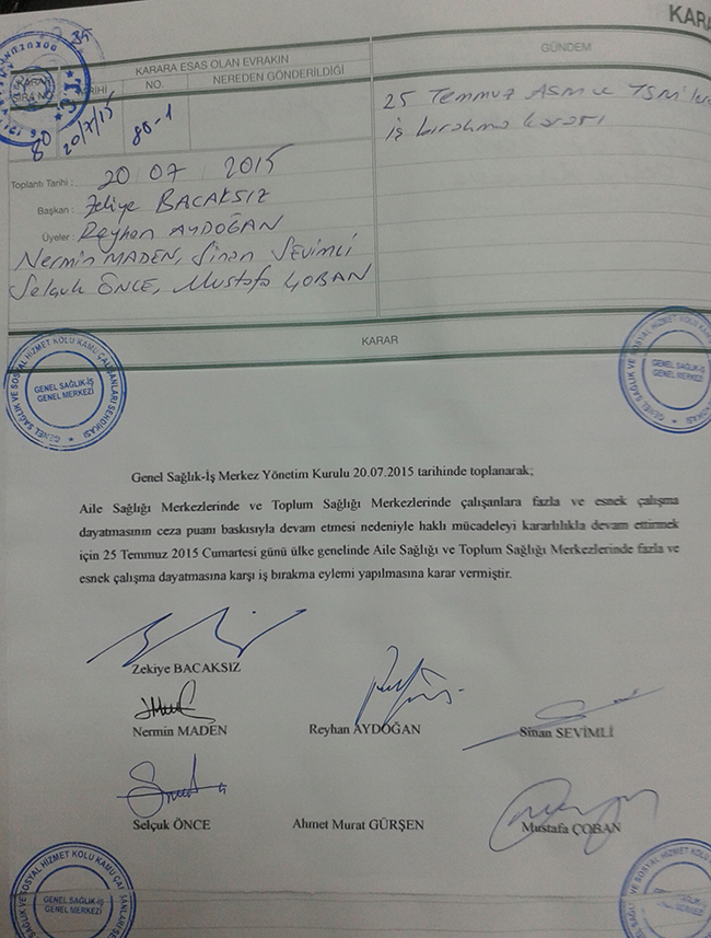 Genel Sağlık- İş Merkez Yönetim Kurulu 20.07.2015 tarih ve 80-1 sayılı kararı ile Aile Sağlığı Merkezlerinde ve Toplum Sağlığı Merkezlerinde çalışanlara fazla ve esnek çalışma dayatmasının ceza puanı baskısıyla devam etmesi nedeniyle haklı mücadeleyi kararlılıkla devam ettirmek için 25 Temmuz 2015 Cumartesi günü ülke genelinde Aile Sağlığı ve Toplum Sağlığı Merkezlerinde fazla ve esnek çalışma dayatmasına karşı iş bırakma eylemi yapılmasına karar verilmiştir.