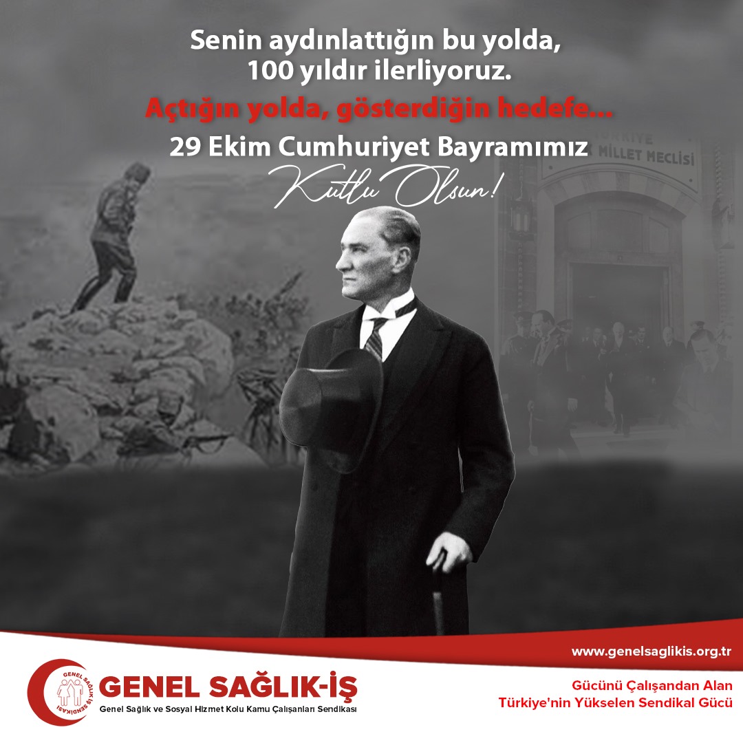 Cumhuriyetin asırlık kazanımlarına ve değerlerine el uzatanlara karşı mücadelesinde hiçbir tereddütte düşmeyen Sendikamız Genel Sağlık-İş, Ebedi Önderimiz Mustafa Kemal Atatürk’ün emanetinin 100. yılını kutlayan Türkiye Cumhuriyeti’ni korumak ve yüceltmek kararlılığına devam edecektir. Atatürk’ün “Milli kahramanlık ve bilincin kıymetli eseri olan aziz Cumhuriyetin, bugünkü ve yarınki neslin demir ellerinde her an yükselip sağlamlaşacağına itimadım tamdır.” sözüne yürekten inanıyoruz. Atatürk’ün İlke ve devrimlerinin yılmaz bekçileri olmaya devam edeceğiz.