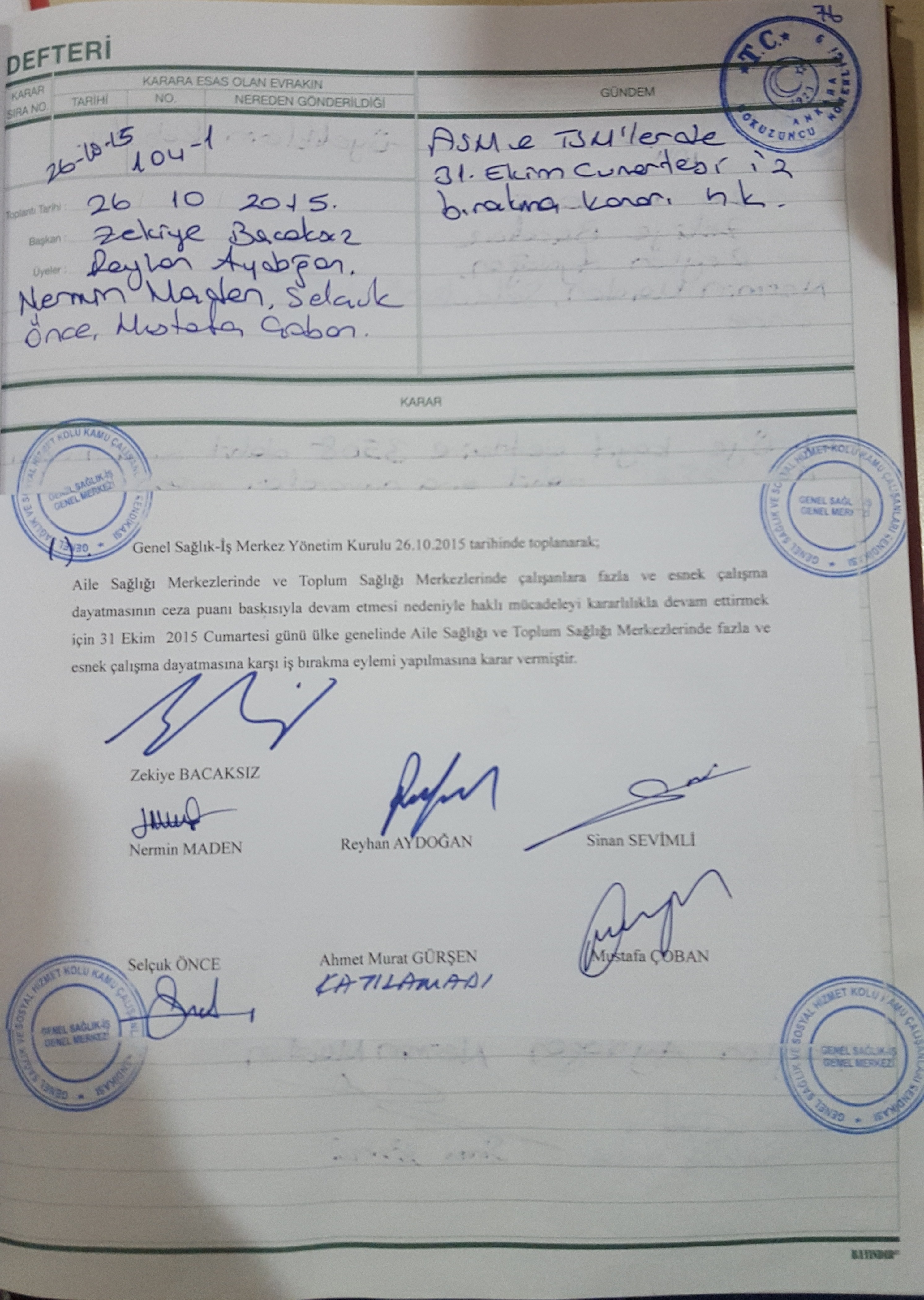Genel Sağlık- İş Merkez Yönetim Kurulu olarak, 26.10.2015 tarihli kararı ile Aile Sağlığı Merkezlerinde ve Toplum Sağlığı Merkezlerinde çalışanlara fazla ve esnek çalışma dayatmasının ceza puanı baskısıyla devam etmesi nedeniyle haklı mücadeleyi kararlılıkla devam ettirmek için 31 Ekim 2015 Cumartesi günü ülke genelinde Aile Sağlığı ve Toplum Sağlığı Merkezlerinde fazla ve esnek çalışma dayatmasına karşı iş bırakma eylemi yapılmasına karar verilmiştir.