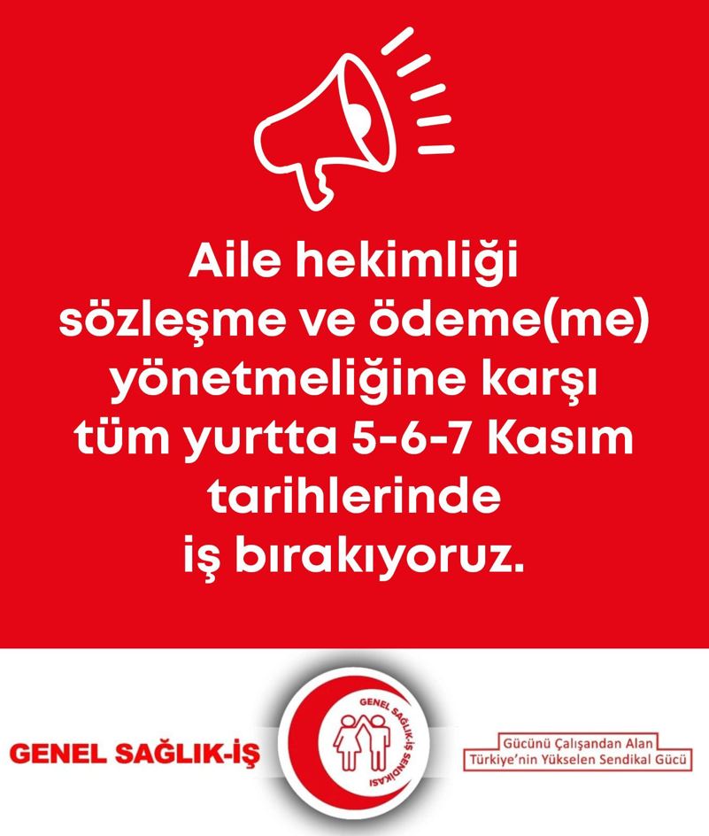 Genel Sağlık-İş olarak, SAĞLIK VE SOSYAL HİZMET KOLUNDA GÖREVLİ TÜM ÜYELERİMİZİN seslerini duyurabilmesi, taleplerini idareye ulaştırabilmesi, kamuoyunda farkındalık oluşturabilmesi adına, acil sağlık hizmetleri aksatılmamak üzere ve acil hastalar, diyaliz hastaları, gebeler, kanser hastaları, yoğun bakım hastalarının bakımı aksamayacak, diğer hastalara nöbet düzeninde sağlık hizmeti verilecek şekilde, Sendikamızın ve aynı alanda faaliyet gösteren diğer sendika ile meslek örgütlerinin de bulunduğu Sağlık Emek Meslek Örgütü Platformu çatısı altında alınan karar doğrultusunda, Türkiye Genelinde 05.11.2024, 06.11.2024 ve 07.11.2024 tarihinde 3(üç) günlük iş bırakılmasına oybirliğiyle karar verilmiştir.
