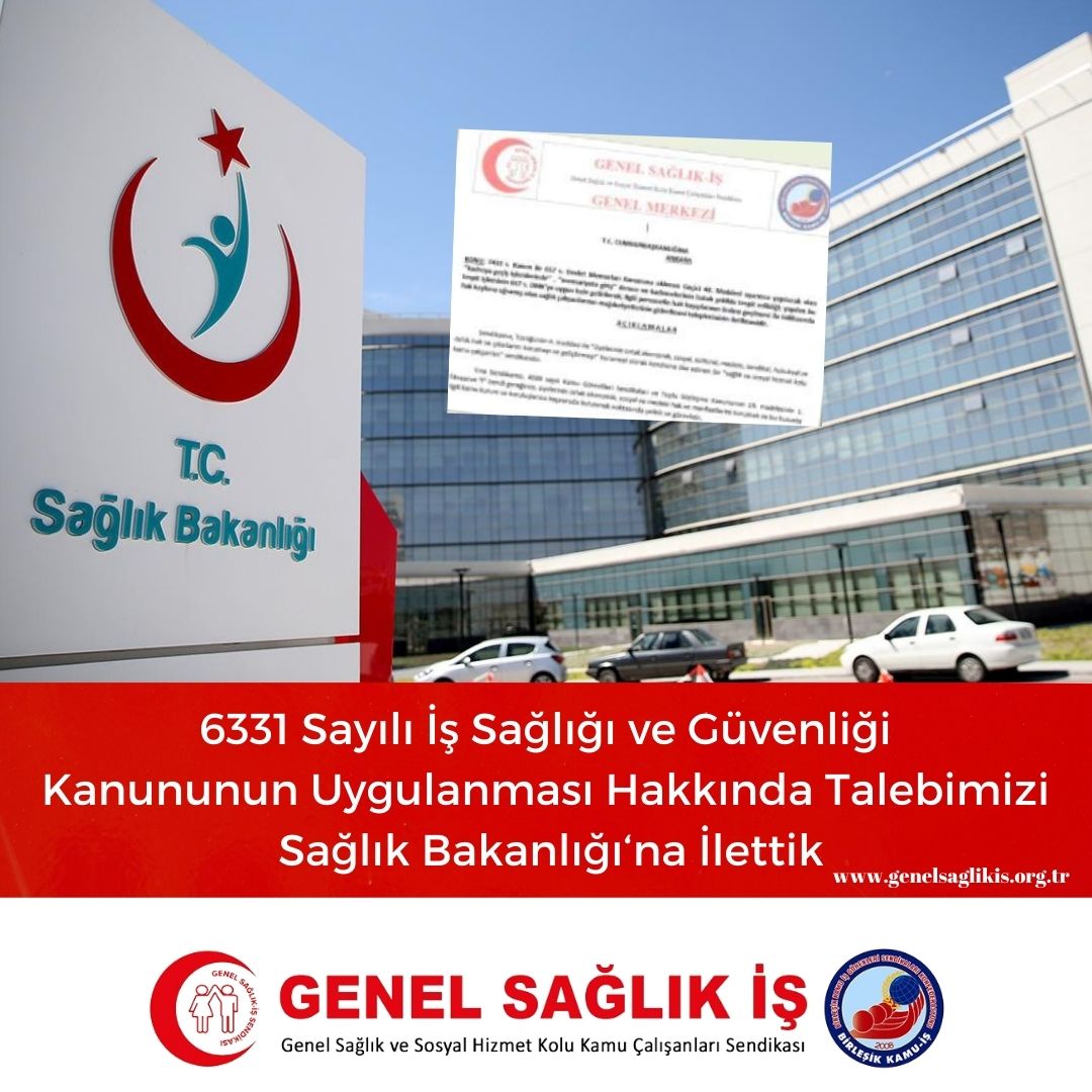 Sendikamız Genel Sağlık-İş tarafından Sağlık Bakanlığı’na gönderilen yazı ile bağlı tüm sağlık tesislerinde 6331 Sayılı İş Sağlığı ve Güvenliği Kanununun Uygulanmasına yönelik, iş sağlığı ve güvenliği hizmetlerinin ve İSGB birimlerinin kurulması ile ilgili ve iş sağlığı ve güvenliği kanununun tesislerde uygulanmasında, bakanlığın hangi iş ve işlemleri yapacağına veya yaptığına dair bilgilendirmenin tarafımıza yapılması talep ettik.