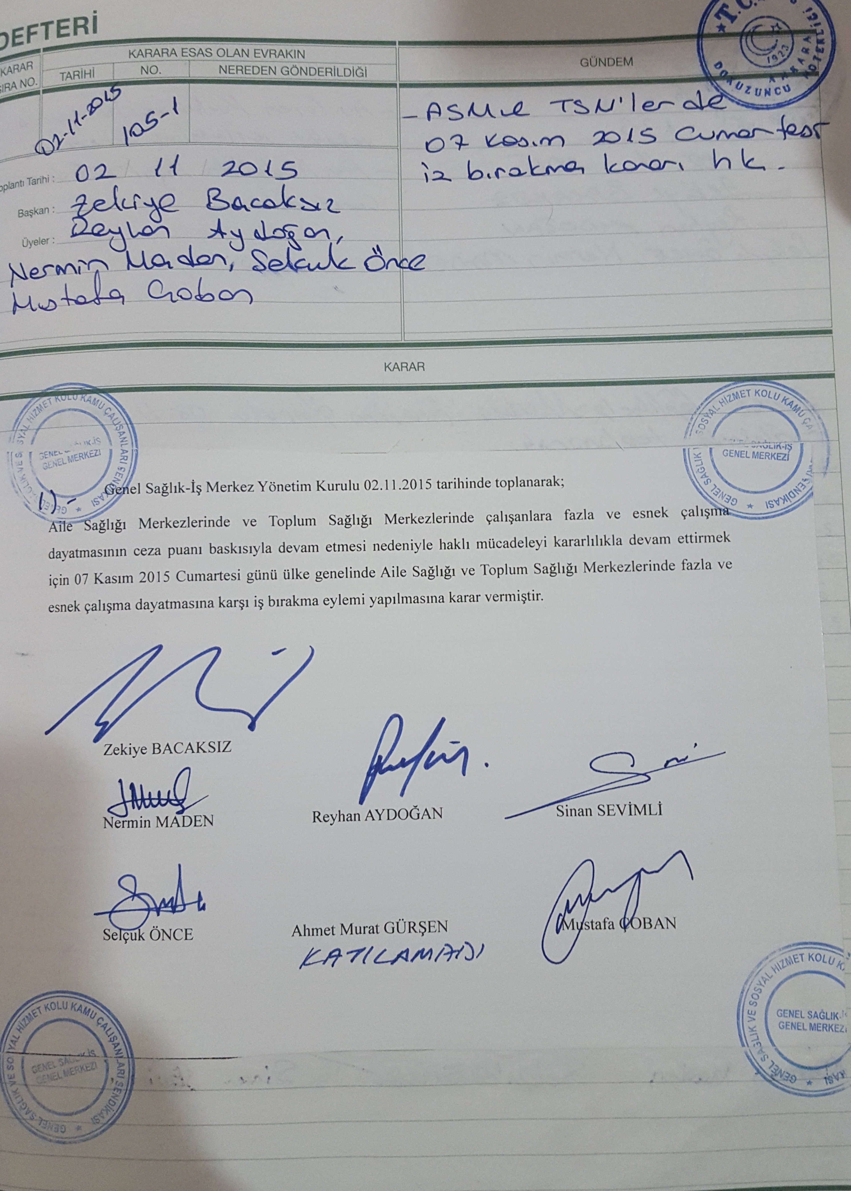 Genel Sağlık- İş Merkez Yönetim Kurulu olarak, 02.11.2015 tarihli kararı ile Aile Sağlığı Merkezlerinde ve Toplum Sağlığı Merkezlerinde çalışanlara fazla ve esnek çalışma dayatmasının ceza puanı baskısıyla devam etmesi nedeniyle haklı mücadeleyi kararlılıkla devam ettirmek için 7 KASIM 2015 Cumartesi günü ülke genelinde Aile Sağlığı ve Toplum Sağlığı Merkezlerinde fazla ve esnek çalışma dayatmasına karşı iş bırakma eylemi yapılmasına karar verilmiştir.