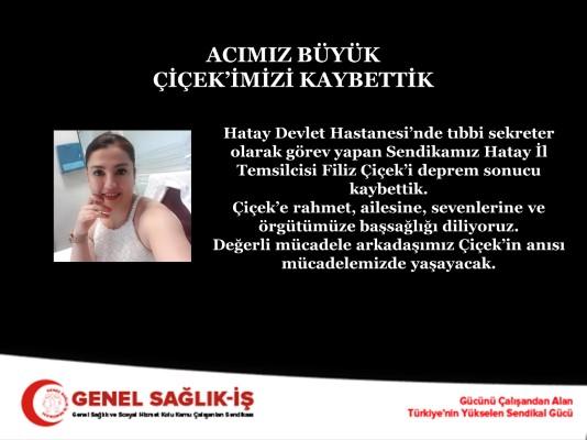 Hatay Devlet Hastanesi’nde tıbbi sekreter olarak görev yapan Sendikamız Hatay İl Temsilcisi Filiz Çiçek’i deprem sonucu kaybettik.