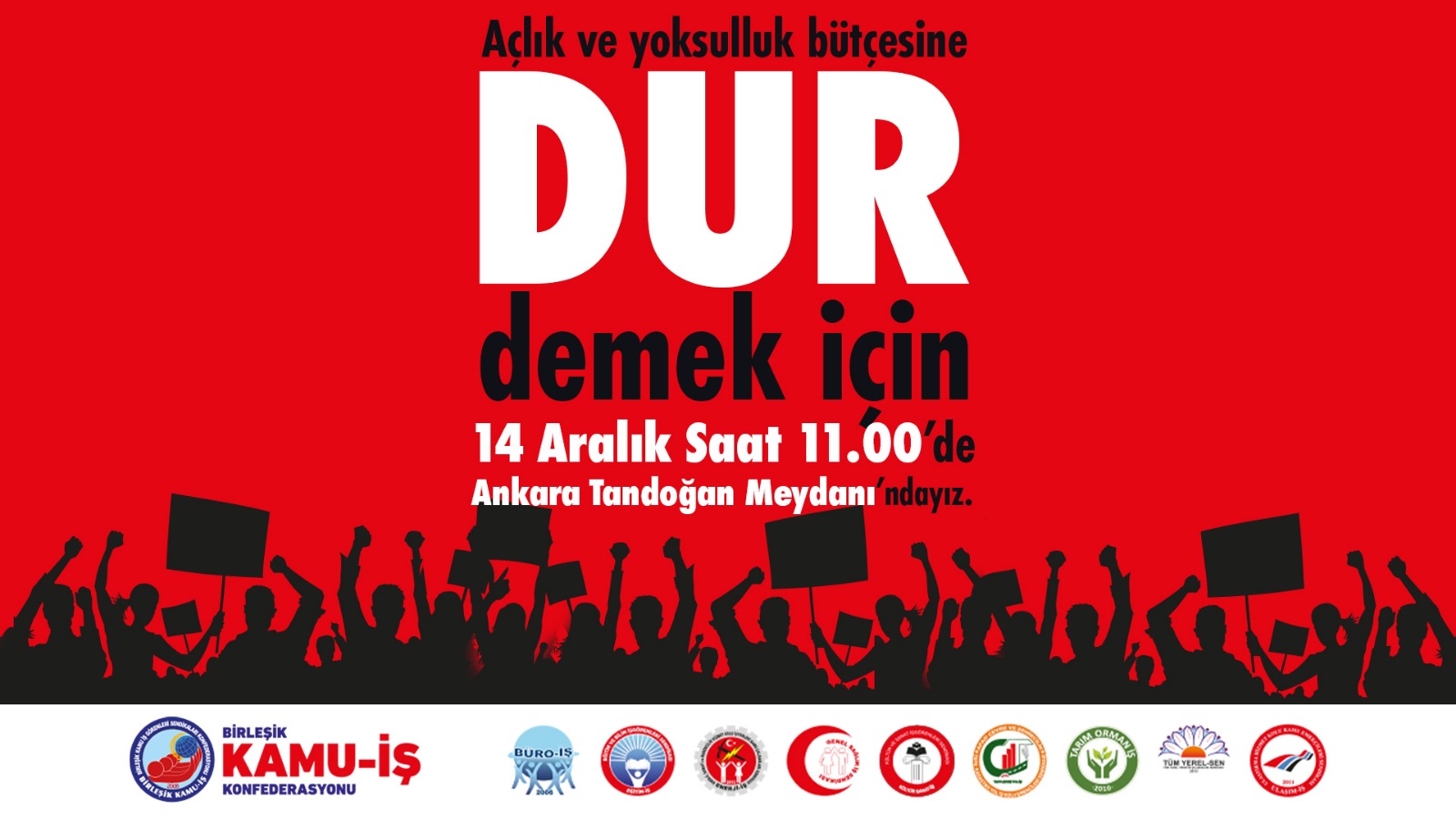 Emeğimizi gasp edenlere, iş güvencemize göz dikenlere, soframızdaki ekmeğimize, çocuklarımızın geleceğine kast edenlere, bizleri açlığa ve yoksulluğa mahkûm edenlere karşı 14 Aralık’ta Tandoğan Meydanı’ndayız.