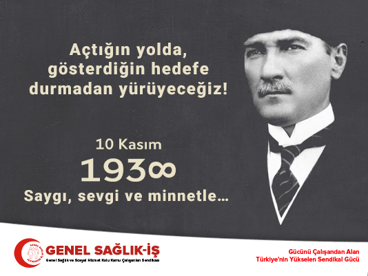 Genel Sağlık-İş, ebedi önderimiz Atatürk’ün bizlere emanet ettiği bağımsız Türkiye Cumhuriyeti’ni, korumak ve yükseltmek için tüm çabayı kararlılıkla sürdürecektir. Açtığı yolda, gösterdiği hedefe hiç durmadan yürüyeceğimize ant içiyor, Ebedi Önderimiz Mustafa Kemal Atatürk’ün aziz hatırası önünde saygıyla eğiliyoruz.