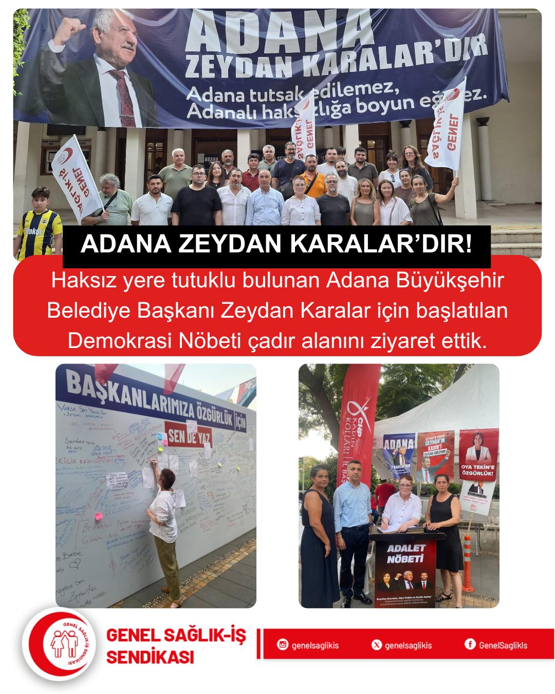 Haksız yere Tutsak edilen Adana Büyükşehir Belediye Başkanı Zeydan Karalar için başlatılan demokrasi nöbetine destek ziyaretinde bulunduk. Genel Başkanımız Dr. Derya Uğur, Genel Sekreterimiz Veli Can Karabacak, Genel Hukuk ve TS Sekreterimiz Yalçın Çiftçi, Genel Örgütlenme Sekreterimiz Özcan Arslan, Genel Basın Yayın ve Eğitim Sekreterimiz Ali Kemal Akgül, Genel Mali Sekreterimiz Gazi Çeliker ve Adana Şubesi üyelerimizin katılımı ile Alanda kurulmuş olan çadırı ziyaret ederek haksız yere tutsak edilen Zeydan Karalar için destek mesajlarımızı ilettik.