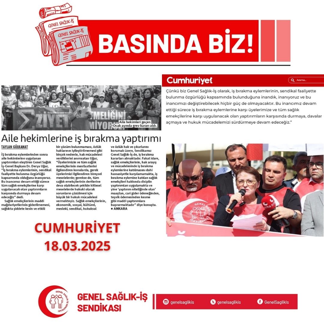 İş bırakma eylemlerinden sonra aile hekimlerine uygulanan yaptırımları eleştiren Genel Sağlık İş-Genel Başkanı Dr. Derya Uğur, “İş bırakma eylemlerinin, sendikal faaliyette bulunma özgürlüğü kapsamında olduğuna inanıyoruz. Bu inancımız devam ettiği sürece tüm sağlık emekçilerine karşı uygulanacak olan yaptırımların karşısında durmaya devam edeceğiz” dedi.
