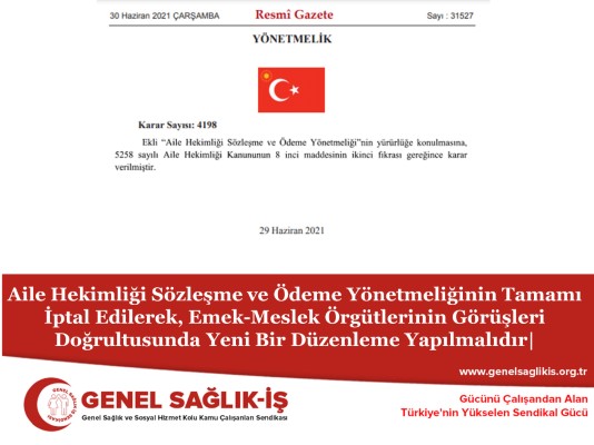 Aile Hekimliği Sözleşme ve Ödeme Yönetmeliği yayınlandığı tarihten itibaren Sendikamız Genel Sağlık-İş, bunun bir ceza yönetmeliği olduğunu, işyerlerinde, alanlarda, yazılı ve görsel basında defalarca haykırmıştı. Sendikamız, bu süreçte uygulanması mümkün olmayan maddeleri Danıştay'a taşımıştı. Genel Sağlık-İş’in mücadelesindeki haklılığı, Anayasa Mahkemesi (AYM) kararı ortaya çıkarmıştır. AYM sesimize ses olmuştur. İş bilmez Sağlık Bakanlığı bürokratlarının yanlış düzenlemelere imza attığını AYM kararı bir kez daha ortaya koymuştur.