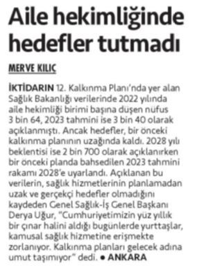 27.10.2023 tarihinde Cumhuriyet Gazetesi'nde çıkan ilgili haber bağlantısı https://www.cumhuriyet.com.tr/saglik/aile-hekimliginde-hedefler-tutmadi-2134546?utm_medium=HaberKaynagi&utm_source=HaberKaynagi