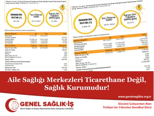 Son dönemde, elektrik tüketimine yapılan zamlar neticesinde, birinci basamak sağlık kurumu olan Aile Sağlığı Merkezlerinde kullanılan elektrik nedeniyle, Aile Sağlığı Merkezlerinde görevli Genel Sağlık-İş üyeleri ile Aile Sağlığı Merkezlerinde görev yapmakta olan tüm sağlık çalışanları, ağır bir elektrik faturası maliyeti yükü altında kalmaktadırlar. Aile Sağlığı Merkezlerinin, elektrik tüketiminin, “ticarethane aboneliği” üzerinden fiyatlandırılması, aile hekimlerini ve aile sağlığı çalışanlarını daha da güç duruma düşürmekte, yapılan aile sağlığı merkezi gider ödenekleri, elektrik faturasıyla birlikte Aile Sağlığı Merkezi giderlerinin karşılanmasına yetersiz kalmaktadır.