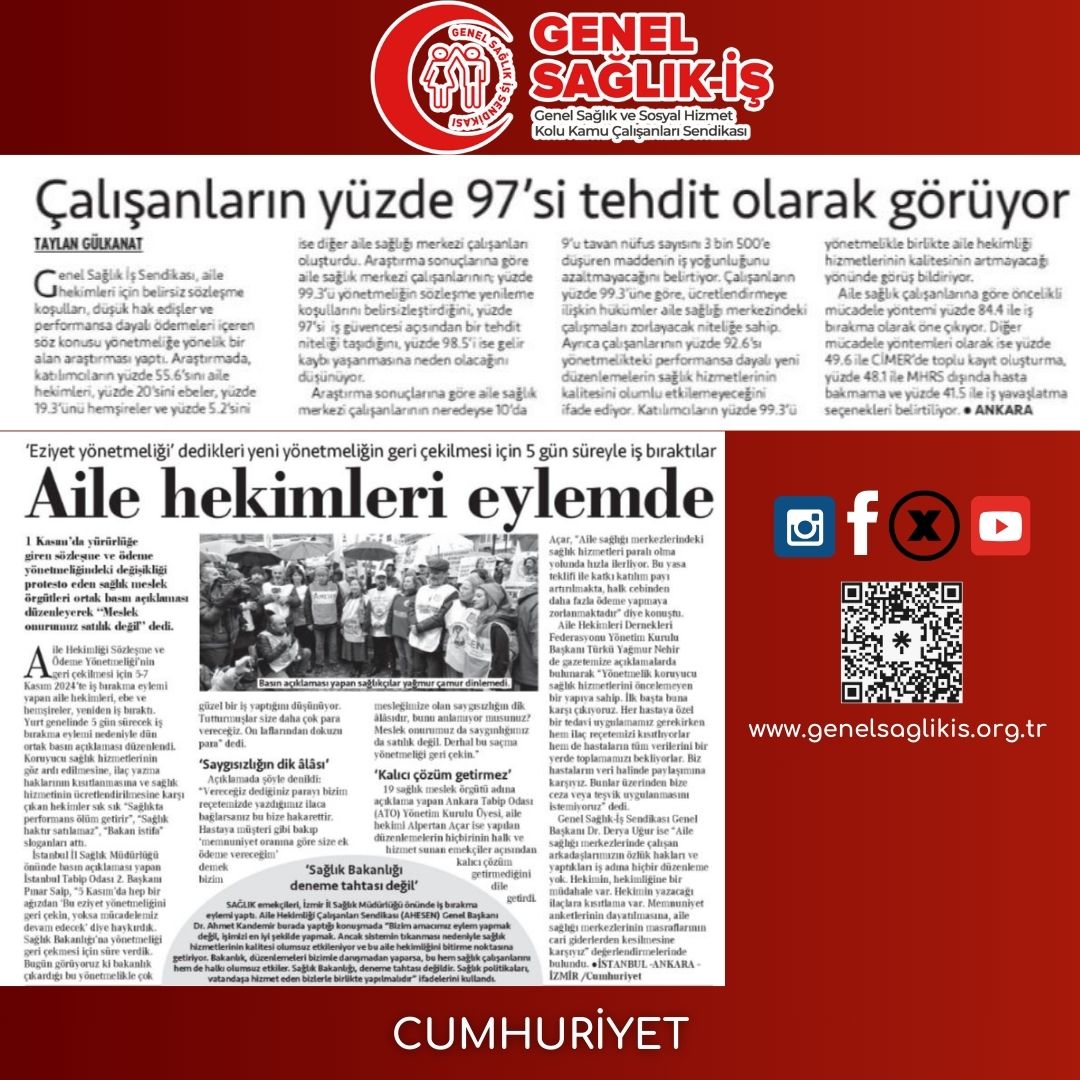 HABER LİNKLERİ: https://www.cumhuriyet.com.tr/saglik/aile-saglik-merkezi-calisanlarinin-yuzde-97si-yeni-yonetmeligi-2275008 / Aile sağlık merkezi çalışanlarının yüzde 97’si yeni yönetmeliği ‘tehdit’ olarak görüyor