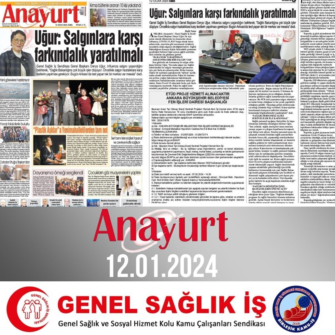 Genel Sağlık İş Sendikası Genel Başkanı Derya Uğur, bir aya yakın süredir ülkemizde hız kesmeden süren influenza, COVID-19, RSV başta olmak üzere adenovirüs, rotavirüs gibi mevsimsel virüslerin kaynaklık ettiği salgının sürdüğünü belirti. Sağlık Bakanlığının konuya ilişkin farkındalık yaratması gerektiğini belirten Uğur ayrıca sağlık sektöründeki sorunları da gündeme getirdi.