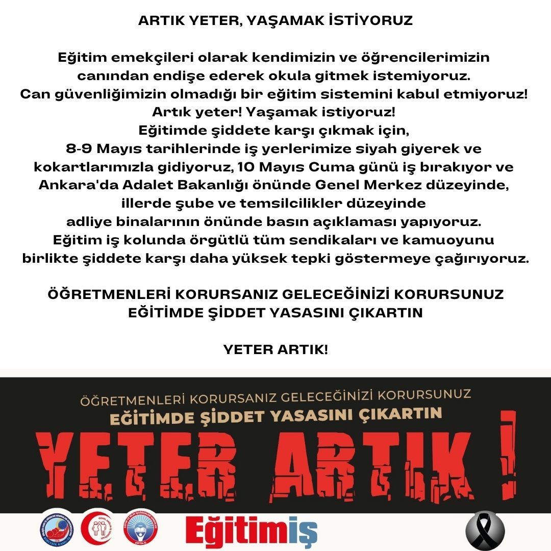 Eğitimde şiddete karşı çıkmak için, 8-9 Mayıs tarihlerinde iş yerlerimize siyah giyerek ve kokartlarımızla gidiyoruz, 10 Mayıs Cuma günü iş bırakıyor ve Ankara'da Adalet Bakanlığı önünde Genel Merkez düzeyinde, illerde şube ve temsilcilikler düzeyinde adliye binalarının önünde basın açıklaması yapıyoruz. Eğitim iş kolunda örgütlü tüm sendikaları ve kamuoyunu birlikte şiddete karşı daha yüksek tepki göstermeye çağırıyoruz.