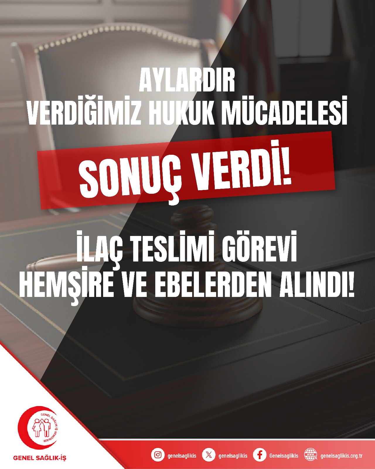 Sendikamız Genel Sağlık-İş, hemşire ve ebelerin eczaneden ilaç teslim almakla yükümlü olmadığı ve bu görevin sağlık bakım teknisyenleri tarafından yapılması gerektiği yönünde uzunca bir süredir gerek hukuksal olarak gerekse fiili olarak mücadele vermektedir. Bu bağlamda sendikamız Genel Sağlık-İş, 11.09.2023 tarihinde Burdur Devlet Hastanesi'nde çalışan üyelerimizin talepleri üzerine Isparta 2. idare mahkemesinde dava açmıştır ve 31.05.2025 tarihinde de hukuka aykırı uygulamanın iptaline karar verilmiştir.