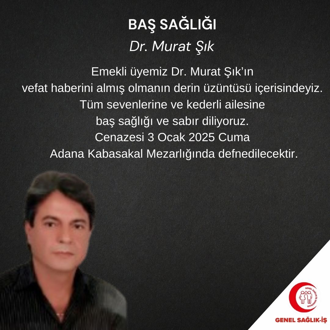 Emekli üyemiz Dr. Murat Şık'ın vefat haberini almış olmanın derin üzüntüsü içerisindeyiz. Tüm sevenlerine ve kederli ailesine baş sağlığı ve sabır diliyoruz. Cenazesi 3 Ocak 2025 Cuma günü Adana Kabasakal Mezarlığında defnedilecektir.