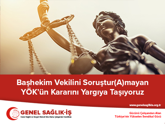 YÖK, yanına iktidar ve yandaşı olan parti temsilcilerini alarak kurumu dışında ama kurumu ile ilgili tehditler savurarak disiplin suçu işleyen DEÜ Hastanesi başhekim vekili hakkında soruşturma yapmama kararı aldı. Genel Sağlık-İş, başhekim vekili hakkında soruşturma yap(A)mayan YÖK’ün kararına karşı Ankara İdare Mahkemesinde iptal davası açtı.