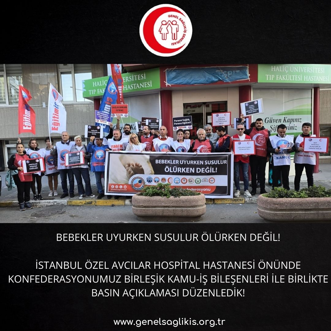 İstanbul Özel Avcılar Hospital Hastanesi önünde Konfederasyonumuz Birleşik Kamu-İş bileşenleri ile birlikte basın açıklaması düzenledik. Sendikamız Genel Sağlık-İş Genel Başkanı Dr. Derya Uğur’un okuduğu basın açıklaması şu şekilde: