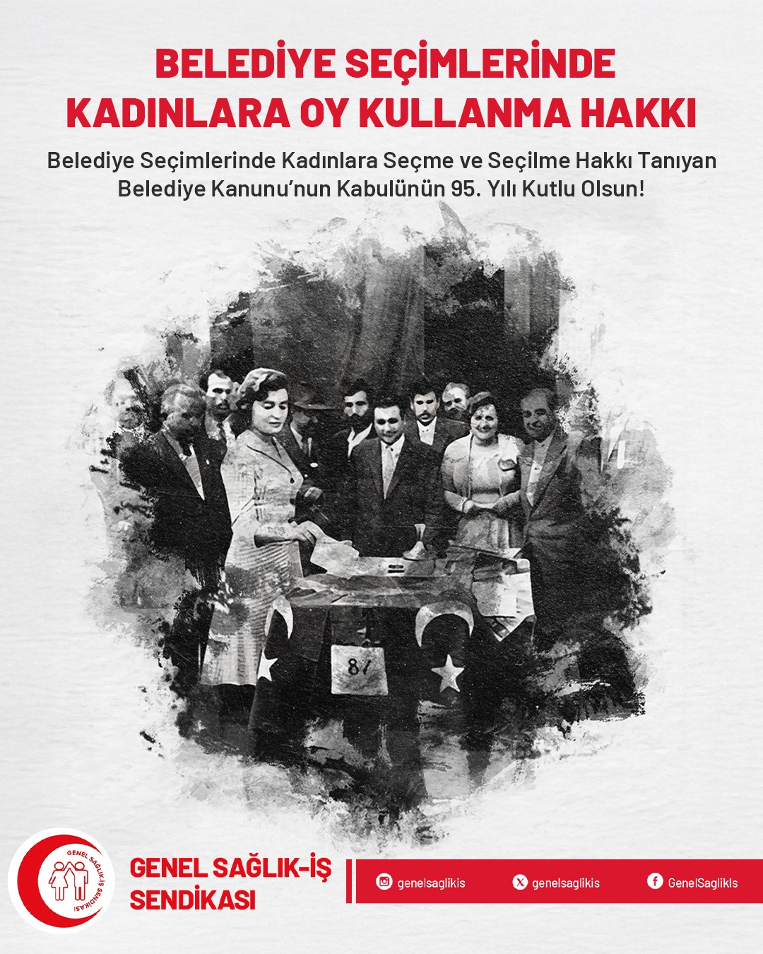 İçinde bulunduğumuz bugünlerde demokrasi, hukukun üstünlüğü, adaletin önemini yoğun bir şekilde idrak ediyor; pek çok Avrupa ülkesinden önce Atatürk devrimlerinin kazanımlarına sahip çıkma zorunluluğumuzun bilinciyle Genel Sağlık-İş olarak Belediye Seçimlerinde Kadınlara Seçme ve Seçilme Hakkı Tanıyan Belediye Kanunu’nun Kabulünün 95. Yılını Kutluyoruz!