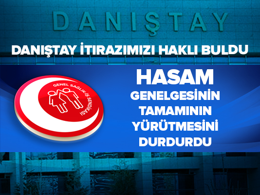 Danıştay, Genel Sağlık-İş’in başvurusu sonucunda; Türkiye Halk Sağlığı Kurumu Başkanlığı’nca yayınlanan ve Halk Sağlığı Merkezleri’nin (HASAM) kurulması düzenleyen 23.03.2016 tarih ve 2016/5 sayılı Genelge’nin yürütmesini durdurdu.