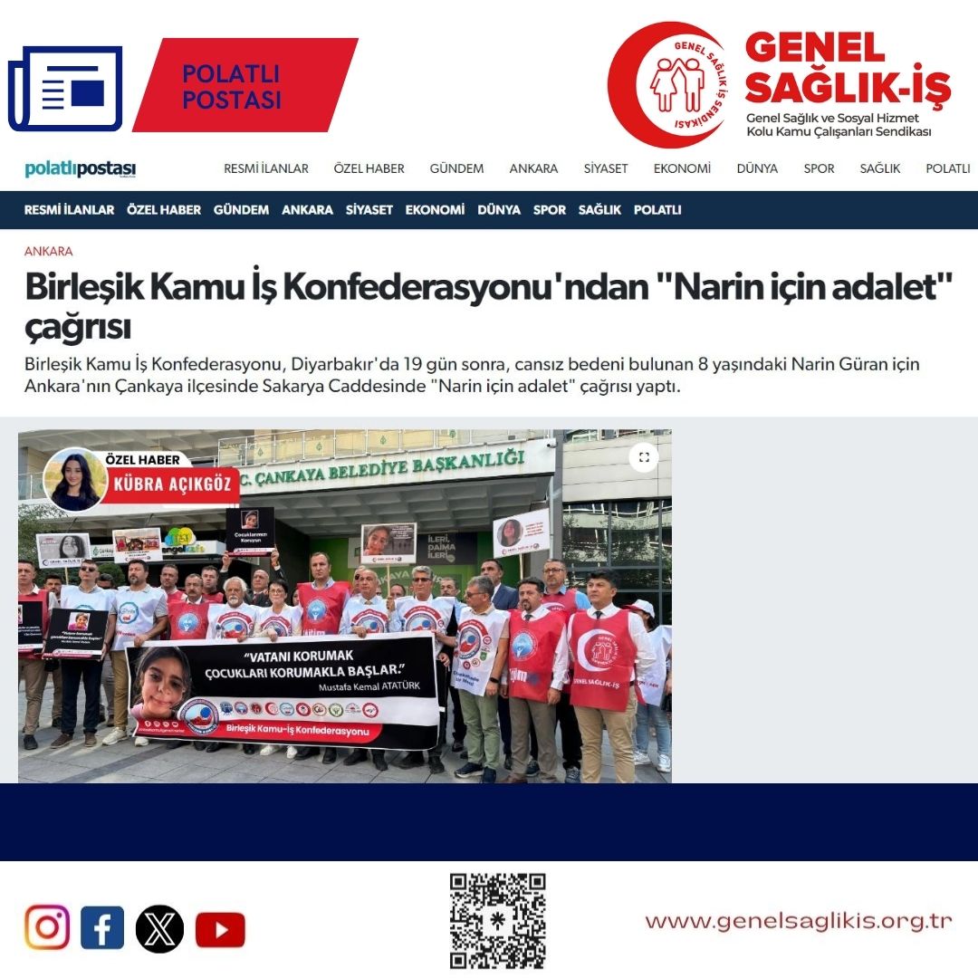 Birleşik Kamu İş Konfederasyonu, Diyarbakır'da 19 gün sonra, cansız bedeni bulunan 8 yaşındaki Narin Güran için Ankara'nın Çankaya ilçesinde Sakarya Caddesinde "Narin için adalet" çağrısı yaptı.21 Ağustos’ta Diyarbakır’ın Bağlar ilçesine bağlı Tavşantepe Mahallesi'nde, Kuran kursundan çıktıktan sonra kaybolan 8 yaşındaki Narin’in cansız bedeni, 19 gün sonra bir dere yatağında, çuval içinde bulundu. Narin'in ölüm haberi tüm Türkiye’yi derinden etkilerken, olayın ardındaki sır perdesinin aralanması ve suçluların adalete teslim edilmesi için ülke genelinden sesler yükseliyor. Toplumun her kesiminden yükselen adalet çağrıları, Narin cinayetinin aydınlatılması, suçlu veya suçluların adalete teslim edilmesi için yükseldi.