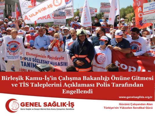 Ankara'daki basın açıklamamız ise polis engeliyle karşılaştı. 6. Dönem Toplu Sözleşme görüşmeleri öncesinde Konfederasyonumuz Birleşik Kamu-İş, Milli Kütüphane önünden Çalışma ve Sosyal Güvenlik Bakanlığı önüne yürümek ve burada basın açıklaması yapmak istedi ancak polis izin vermedi.