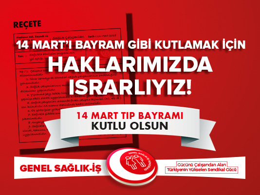 Siyasi iktidar, sağlık çalışanlarının haklı taleplerini görmezden gelmektedir. Bu olumsuz etkileri yok etmek için tek çözüm örgütlü mücadeledir. 14 Mart’ları bayram olarak kutlayabilmek için Cumhuriyetimizin sağlık çalışanlarını bu onurlu mücadelemizde Genel Sağlık-İş’te birlikte mücadeleye çağırıyoruz.