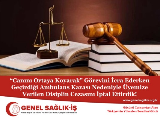 Kararı değerlendiren Genel Sağlık-İş Genel Başkanı Derya Uğur, “İdare, üyemizin sevk ve idaresinde bulunan ambulansın geçiş üstünlüğü bulunduğunu unutmuş, hastanın acil bir hasta olması, diğer sağlık kurumuna acilen yetiştirilmesi gerekliliğini dikkate almaksızın, üyemiz hakkında haksız bir disiplin cezası tesis etmeyi tercih etmiştir. Fakat Çorum İdare Mahkemesi kararı, idareye bir ders olmuş, kaskosunu yaptırmayı unuttukları ambulansın sorumluluğunu, üyemiz üzerinde bırakmaya çalışırlarken, almış olduğumuz iptal kararı nedeniyle sorumluluğu tam olarak karşılarında bulmuşlardır.