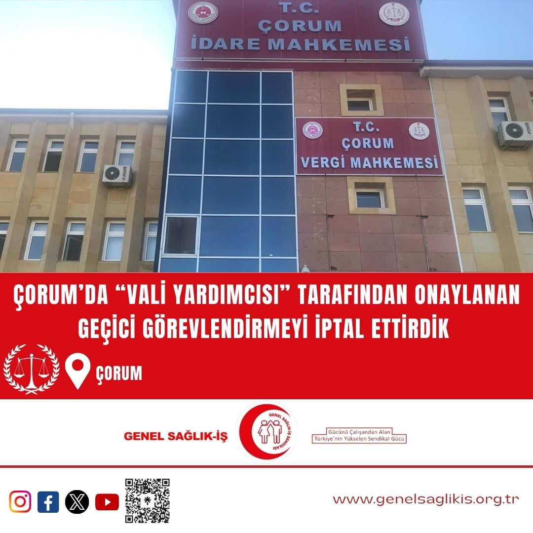 Üyemiz, haksız ve hukuka aykırı geçici görevlendirme nedeniyle, mağduriyetinin giderilmesi talebiyle Sendikamız Genel Sağlık-İş’e başvurmuştur. Sendikamız Hukuk Müşavirliği, üyemizin mağduriyetinin giderilmesi için derhal girişimlere başlamış, Çorum İdare Mahkemesi’nde iptal davası açılmıştır.