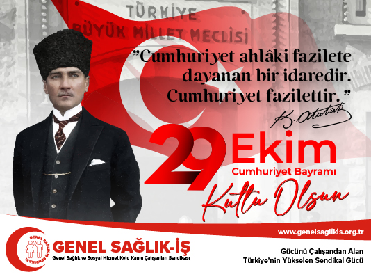 Genel Sağlık-İş, ebedi önderimiz Atatürk’ün emaneti Türkiye Cumhuriyeti’ni korumak ve yüceltmek, Atatürk ilke ve devrimlerini sonsuza kadar yaşatmak için tüm çabayı gösterecektir. Bu anlayış ve kararlılıkla, Cumhuriyetimizin kurucusu Ebedi Önderimiz Mustafa Kemal Atatürk ve mücadele arkadaşlarını saygıyla anıyor, Ulusumuzun 29 Ekim Cumhuriyet Bayramı’nı kutluyoruz.