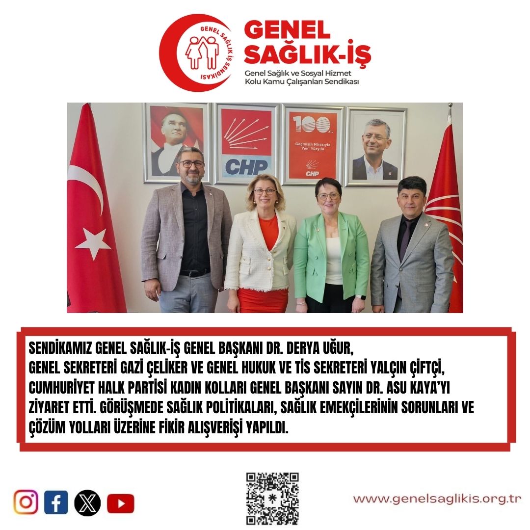 Sendikamız Genel Sağlık-İş Genel Başkanı Dr. Derya Uğur, Genel Sekreteri Gazi Çeliker ve Genel Hukuk ve TİS Sekreteri Yalçın Çiftçi, Cumhuriyet Halk Partisi Kadın Kolları Genel Başkanı Sayın Dr. Asu Kaya’yı ziyaret etti. Görüşmede sağlık politikaları, sağlık emekçilerinin sorunları ve çözüm yolları üzerine fikir alışverişi yapıldı.